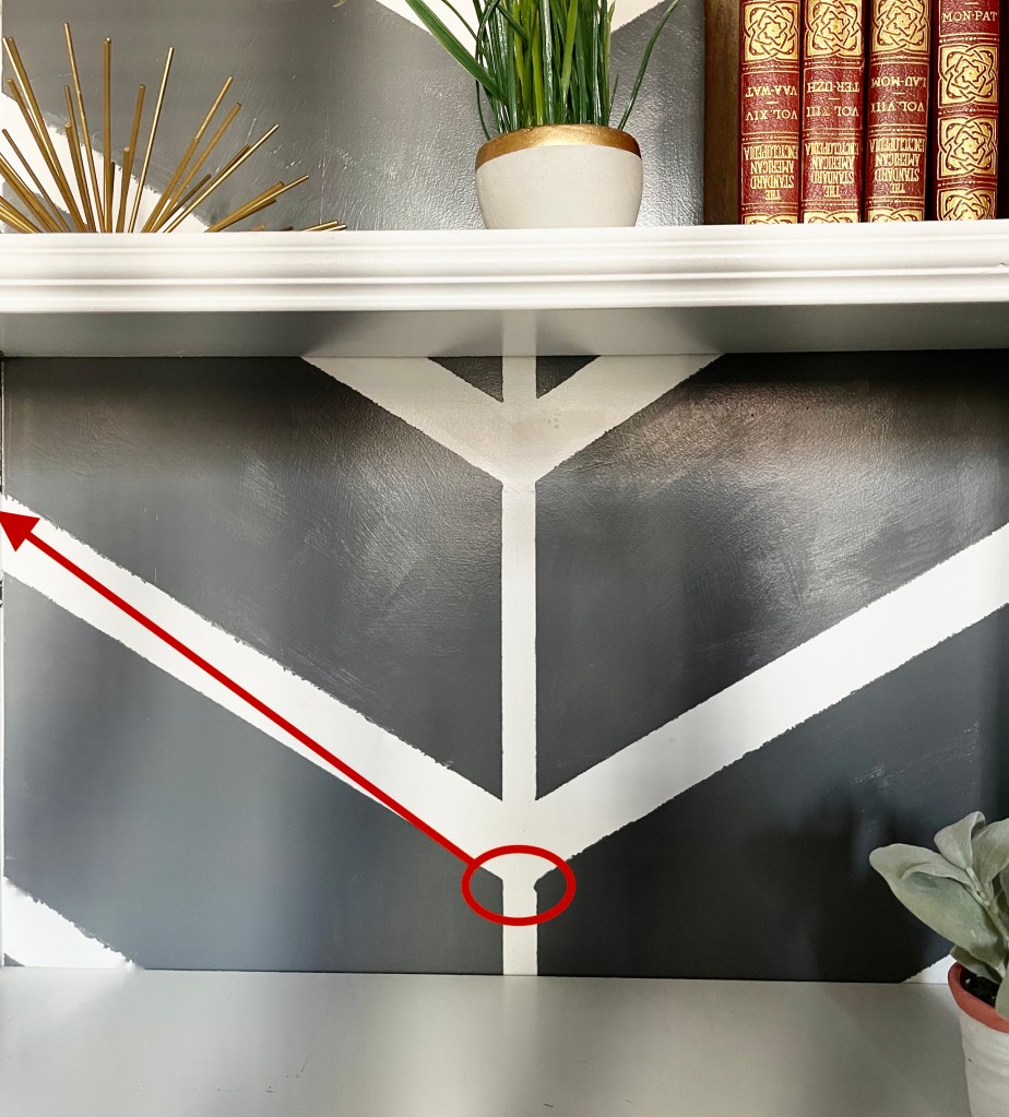 Then I started from top left corner and placed one end of the tape in top left corner of the book case and then brought the other end to the mark I made in step 2 where I marked the tip of the first V. I repeated this on the right side. As I moved down to next V. I placed the tape from my next tip of the next V mark down I made to the far end of my section making the Vs all the way down, You can use your level to make sure that the tops of your V are even.