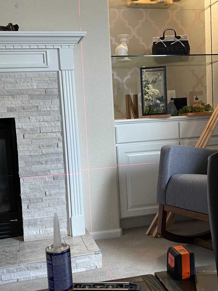 I wanted to use a lighter wood with a more natural tone to make the living room keep its lighter feel. We went to Home Depot and found really great wood that was actually meant for shiplap. I loved the color and it was already stained so we didn’t have to stain it or sand it. (You can do this yourself to make the color more custom)