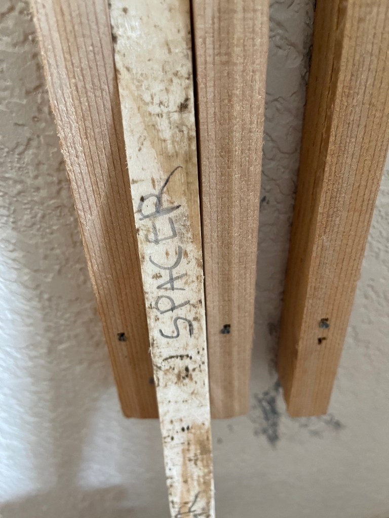 We were ready to put up the first wood slat. The first slat was the most important to make sure was straight because we used that slat to determine the placement of all the other slats. We used a laser level to determine the straight line and then used a regular level to verify and mark the line that we would place the first slat.