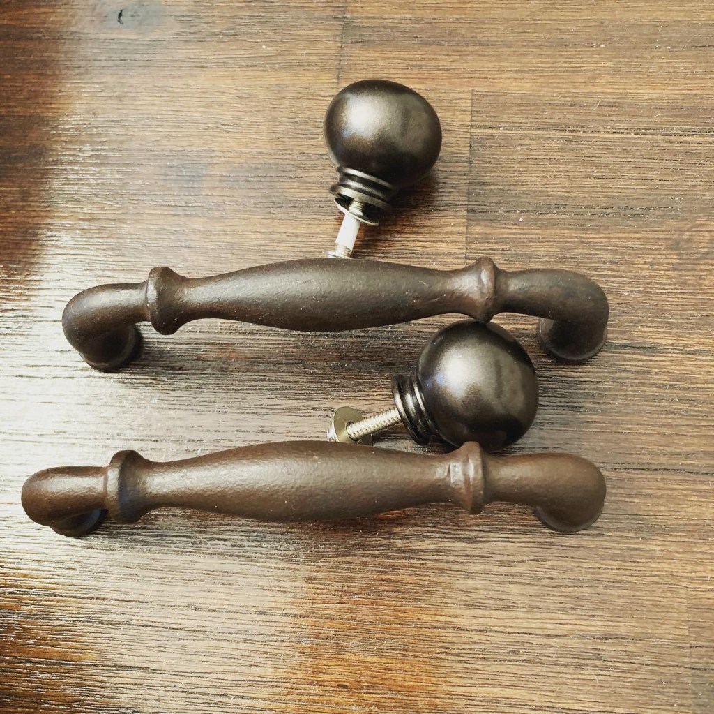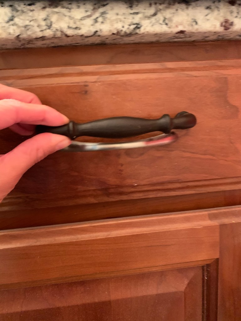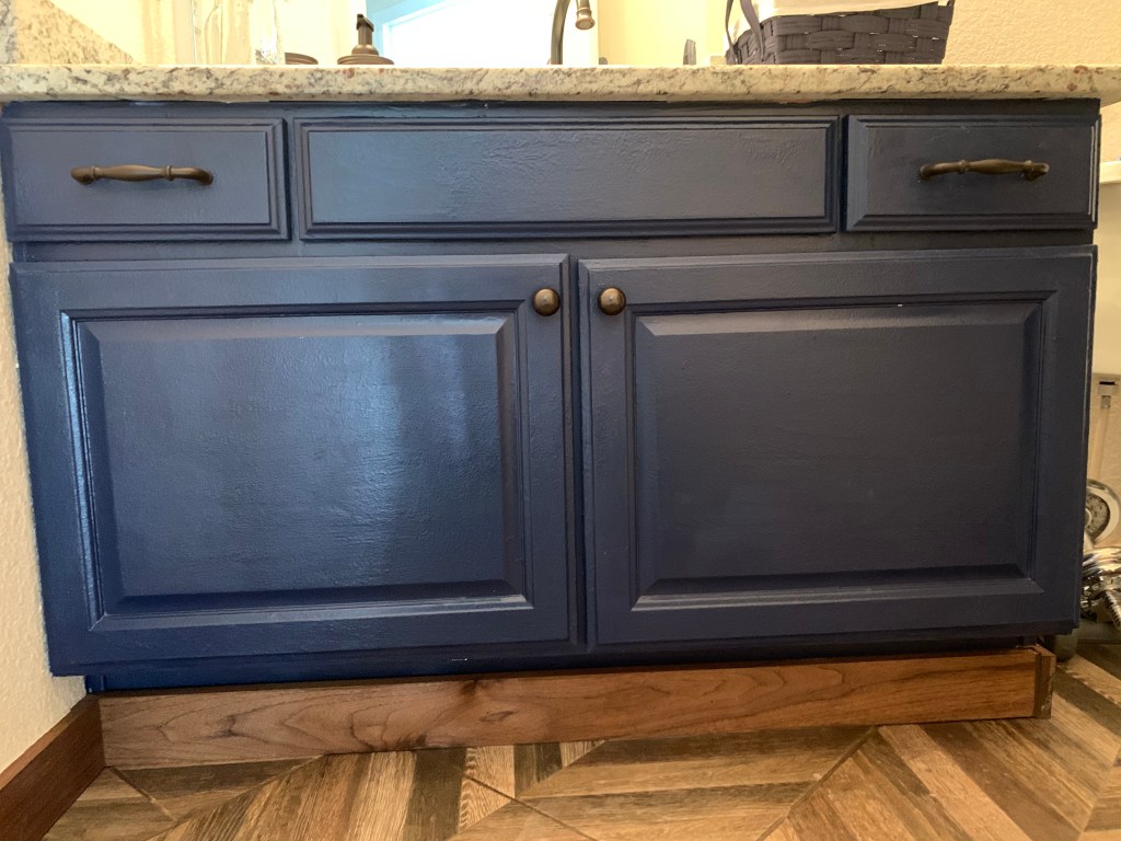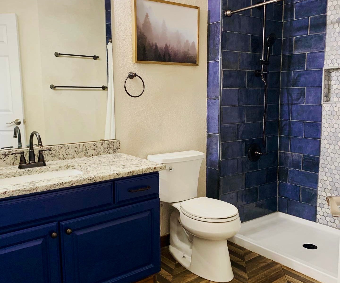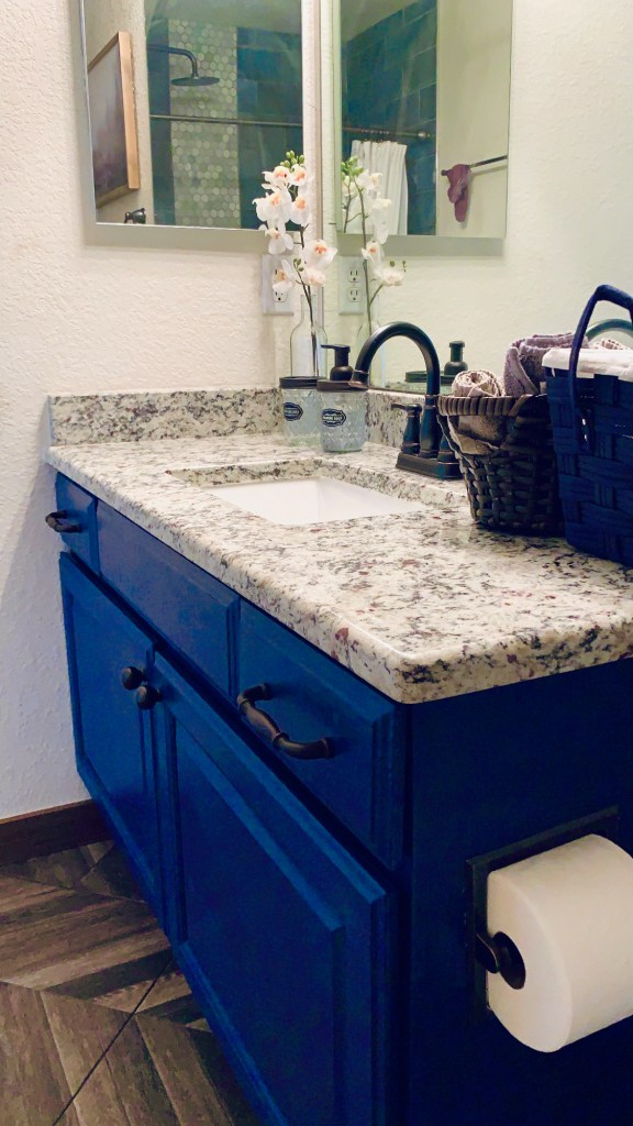 I wanted to add a pop of color but instead of painting the wall I thought painting the bathroom vanity would be a better idea. The vanity was a little outdated so instead of replacing it we up cycled it. We painted the vanity a navy blue color and replaced the knobs. I found really cute knobs at Hobby Lobby that were antique looking and matched the bronze fixtures. We then replaced the sink faucet to match the bronze. I like to have faucets with high arc spout types for the bathroom. High arc spouts are usually found in kitchen sinks so I think they bring a more elevated and unexpected look when used in bathroom design. Since the holes were already cut for a centerset faucet we had to stick with that type. We didn’t want to replace the countertop.