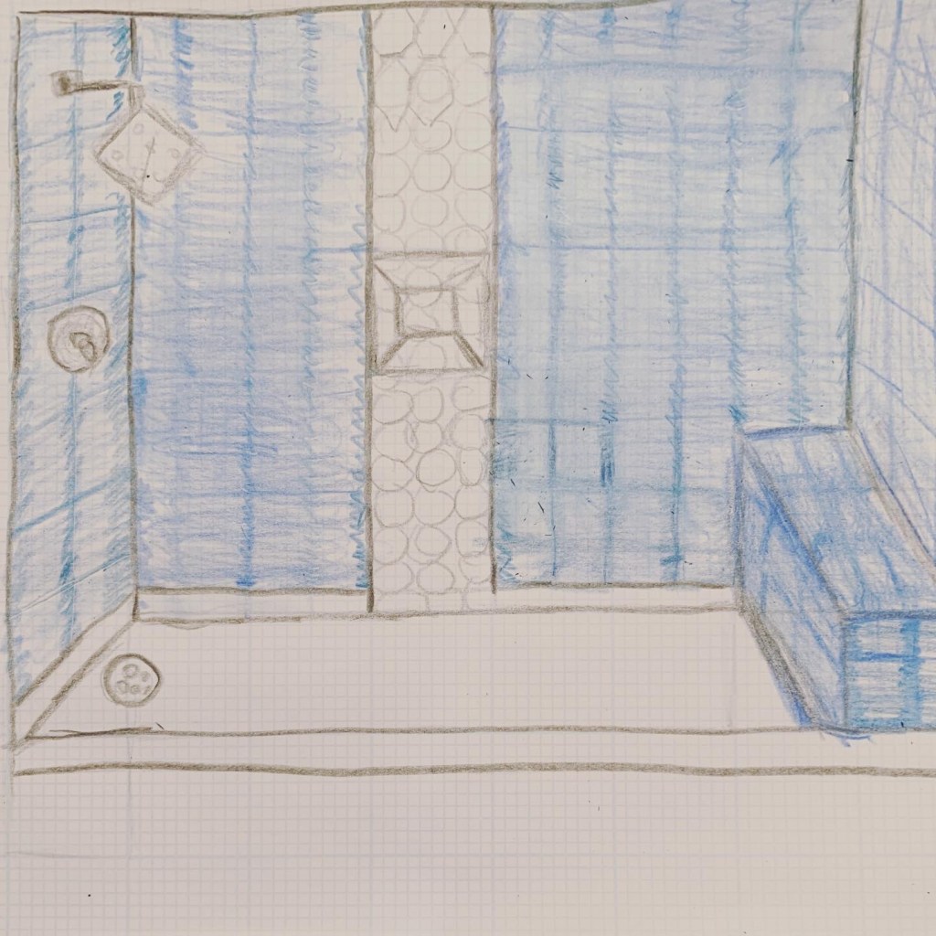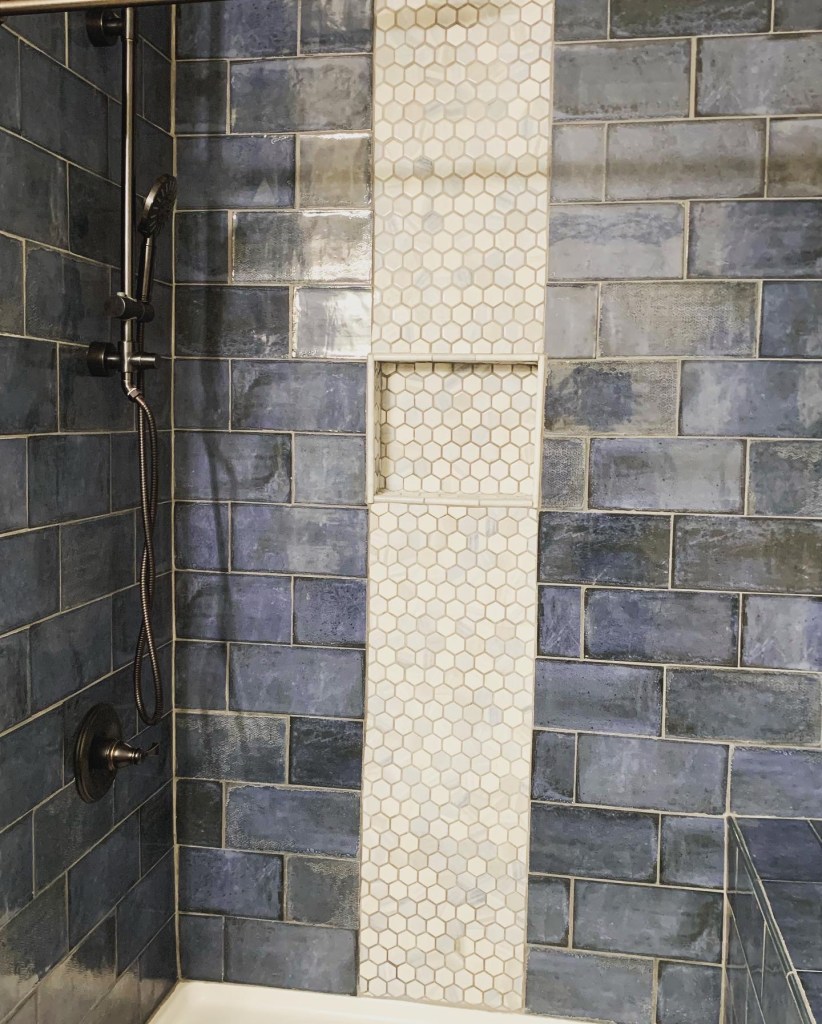 I picked out my shower tile. I like to have a little bit darker tile in my designs because I find with white tile it tends to get dirty quickly and harder to keep clean. It also shows some of the pink water stains sometimes so I stick with a darker grout and tile. If you don’t have a lot of natural light in your bathroom you might want to go with a lighter tile but I personally gravitate towards grey and blues. Shower tile is a great way to make a statement. I like to have shower tile be the bolder design element. Check out my instagram to see more on how I chose the tile.
