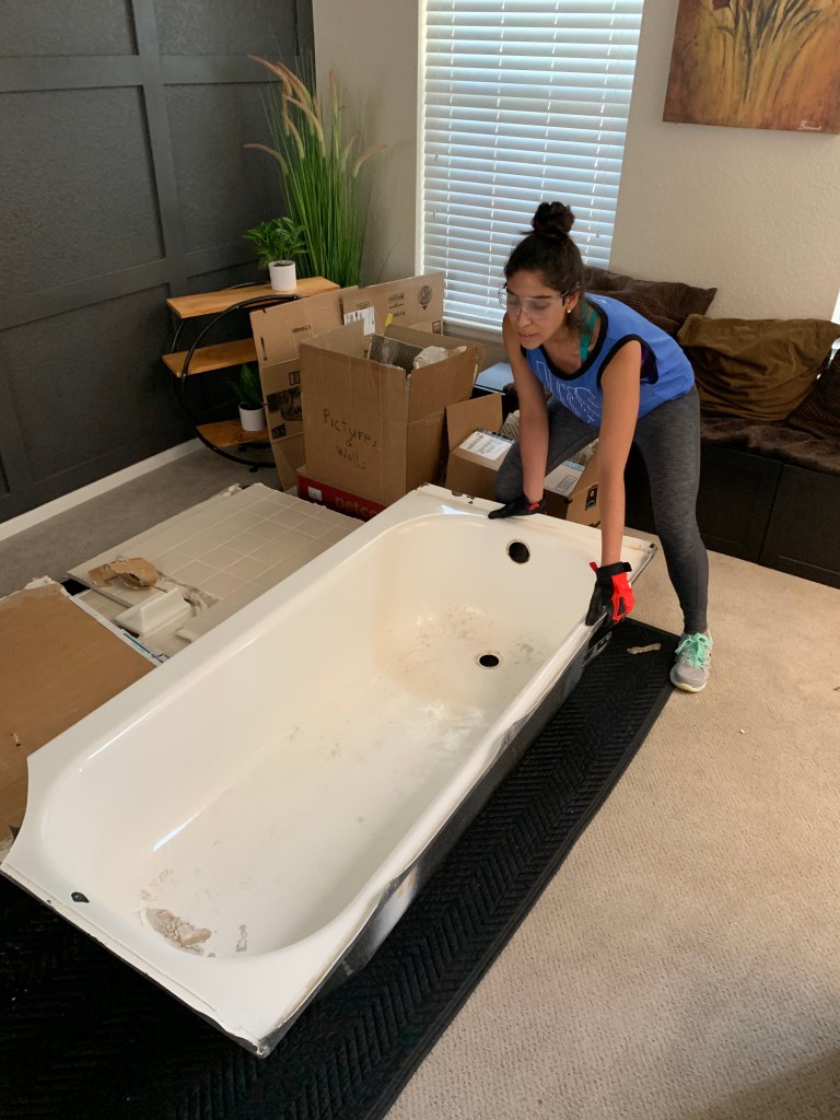 When we moved into our house the guest bathroom was in pretty good condition but we knew we were definitely going to have to upgrade it. It had a shower and tub in one and the shower tile was pink. Once I started cleaning it I found out that the tub wasn’t draining properly and it seemed pretty old.