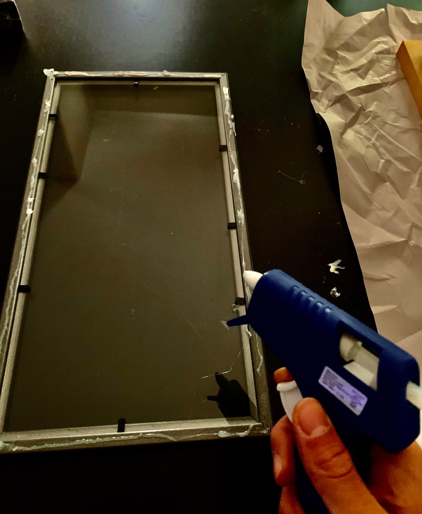 Plug in the glue gun load it with glue stick and put it in a safe space where it wont fall. Organize the frames so that you have all your like size frames together if you are making multiple lanterns. Grab the glue gun and glue the glass panes to the frames so that they are secure. Do this for all your frames and then let dry for an hour or so.