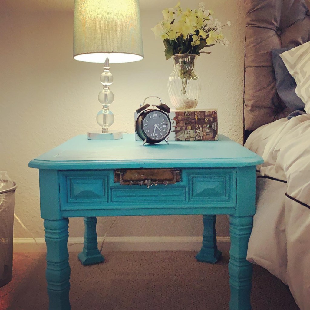 The side table I bought for only $3 at a garage sale. When we bought it the paint was chipping off the table so I bought paint remover and tried to take off the existing paint. This was difficult because the paint was so chipped that it was hard to get it all off so I ended up sanding it a lot. I wanted to paint it turqiouse. When I went to find paint I decided to go with regular paint that we use for walls. I decided against spray paint because in my experience I had to use a lot to get good coverage. The regular wall paint worked great and I didn’t have to use very much for it to cover the whole table. I consulted with the paint counter to make sure I was getting the right gloss and finish. Here is what I got below.