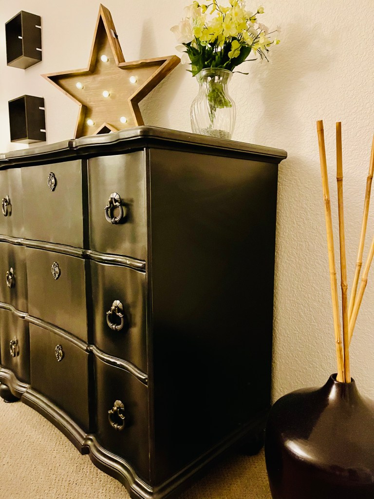 I got the Dresser at an estate sale and negotiated it for $60. I was really drawn to it because of the curvy shape and the decorative knobs. The knobs are so intricate and matched the pattern on the mirror.
