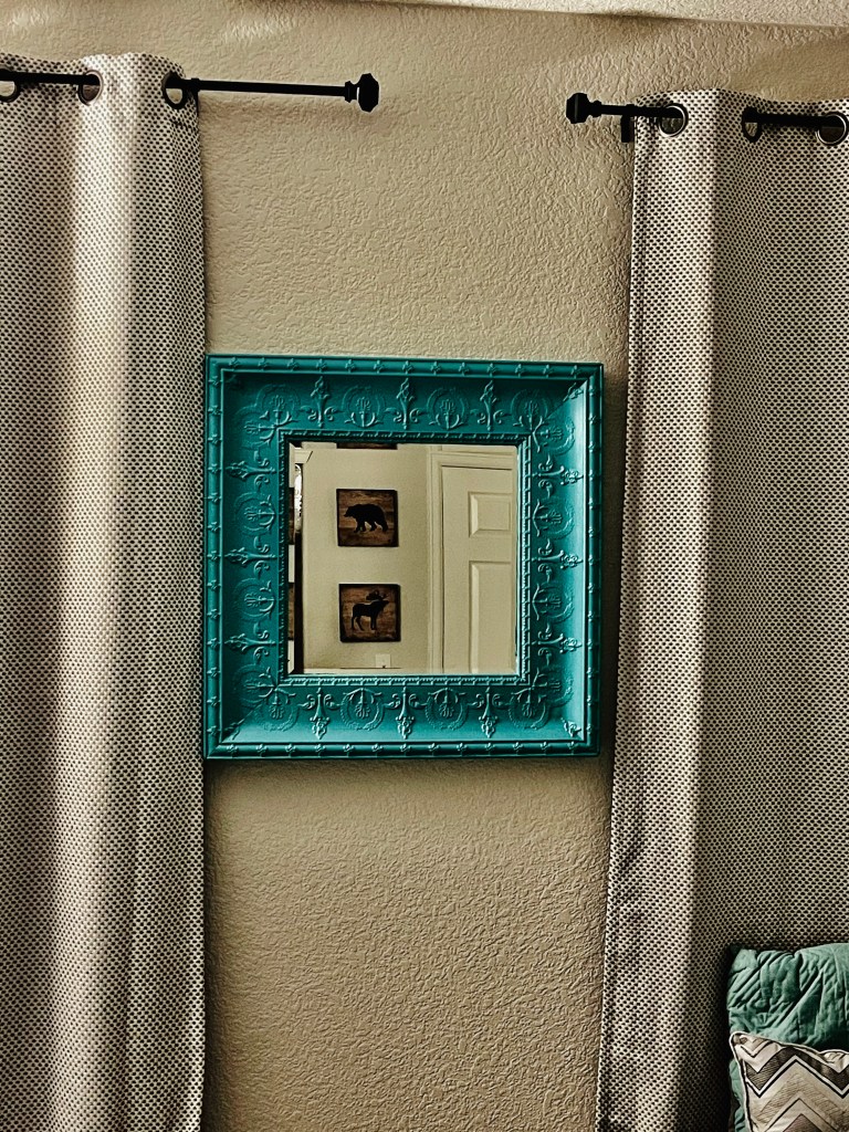 I ended up having enough paint leftover to paint a mirror that I also got a garage sale. The mirror was originally white so it was super easy to paint over it with the turquoise. The color came out great and matched the side table perfectly. I paid only $10 for the mirror.