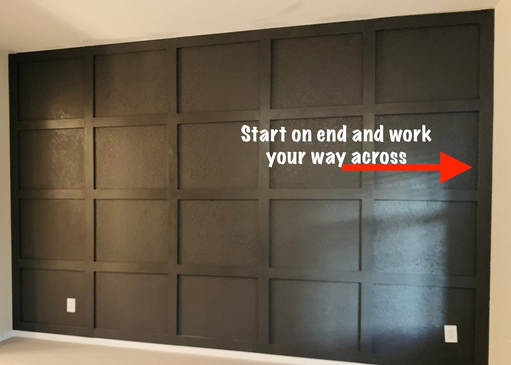 Start with the Vertical pieces. Use liquid nails and squeeze it on the side of the MDF board you want to face towards the wall. You can start from either end. Place the first Vertical piece to wall on one end and secure with Nail gun on the bottom, top and middle. Once you have your first vertical piece up measure the number you calculated in step 2 to get the distance to place the next vertical piece.