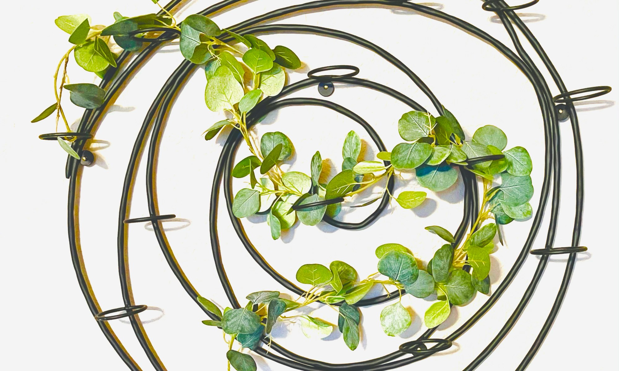 This metal piece was meant to hold lots of small candles. This function seemed a little outdated and would not suit my personal style. I like candles but no that many in one location on the wall. Instead of using the candle holders to hold candles I found a faux eucalyptus wreath and draped it within the candle holders. The candle holders held the wreath perfectly. I got this eucalyptus wreath at Hobby Lobby in the wedding section. Usually anything to do with weddings is expensive but these wreathes were on sale at a great price.