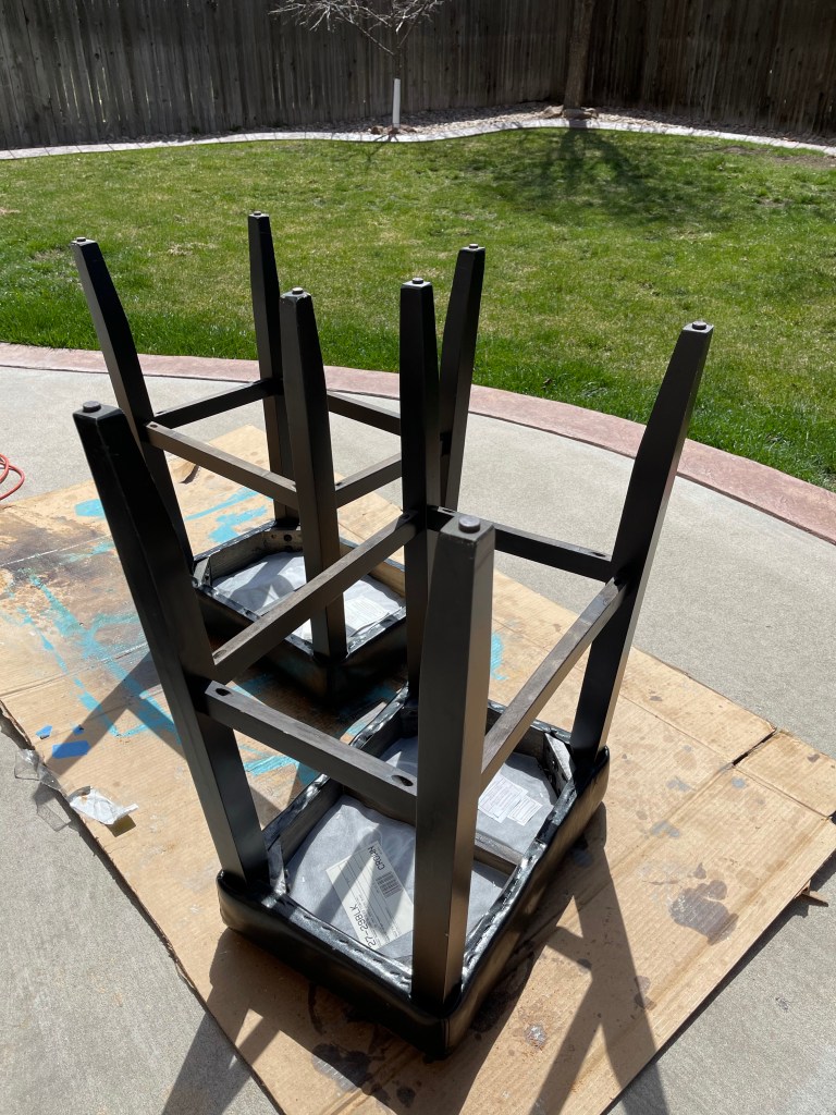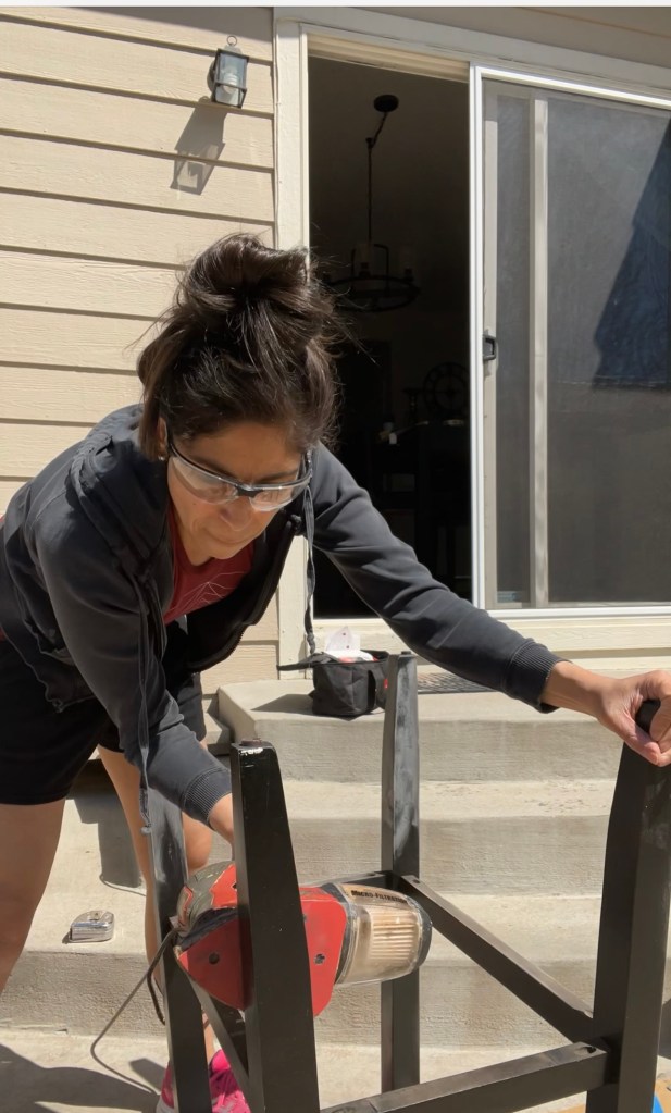 Once I took the fabric off I sanded the bar stool legs with an electric sander. I made sure I got every section of the Barstool legs. Its important to sand really well so that the paint sticks especially since I was going from black to white.