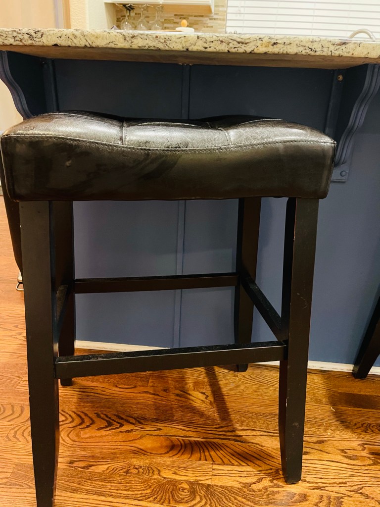 As part of our Spring Projects I wanted to add a pop of color to our all White Kitchen. See Spring Projects, Adding Color post. I painted the Kitchen Island blue to add color. After I painted the Island I realized that the Bar Stools needed an update and did not match the new Island color. As you can see these Bar stools were all black and I wanted to make them more modern and bring new life to them. I don’t know how to sew yet so here is how I did this upgrade with new sewing involved. Read further to see how I turned these generic looking bar stools into custom and modern items.