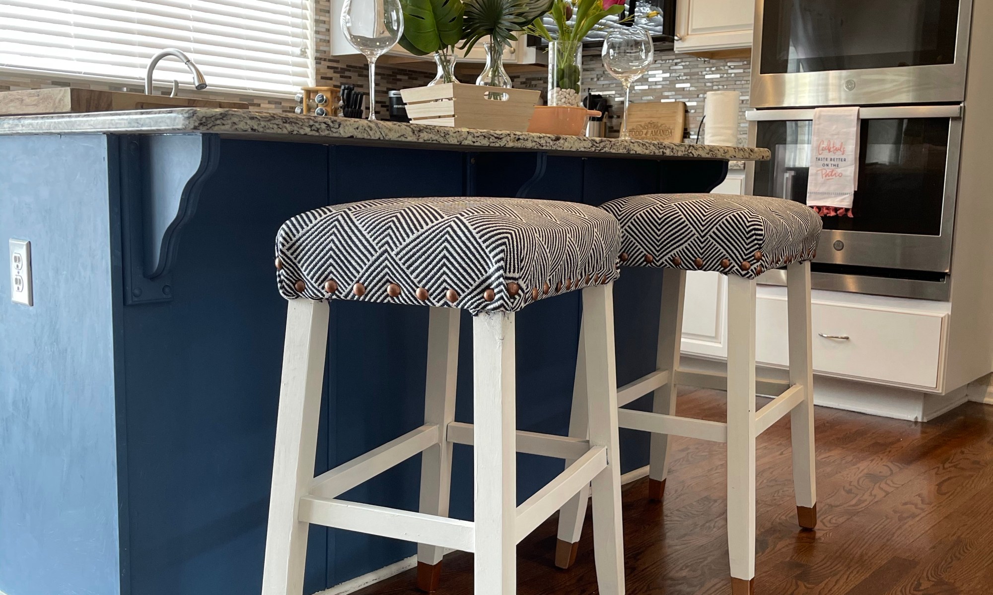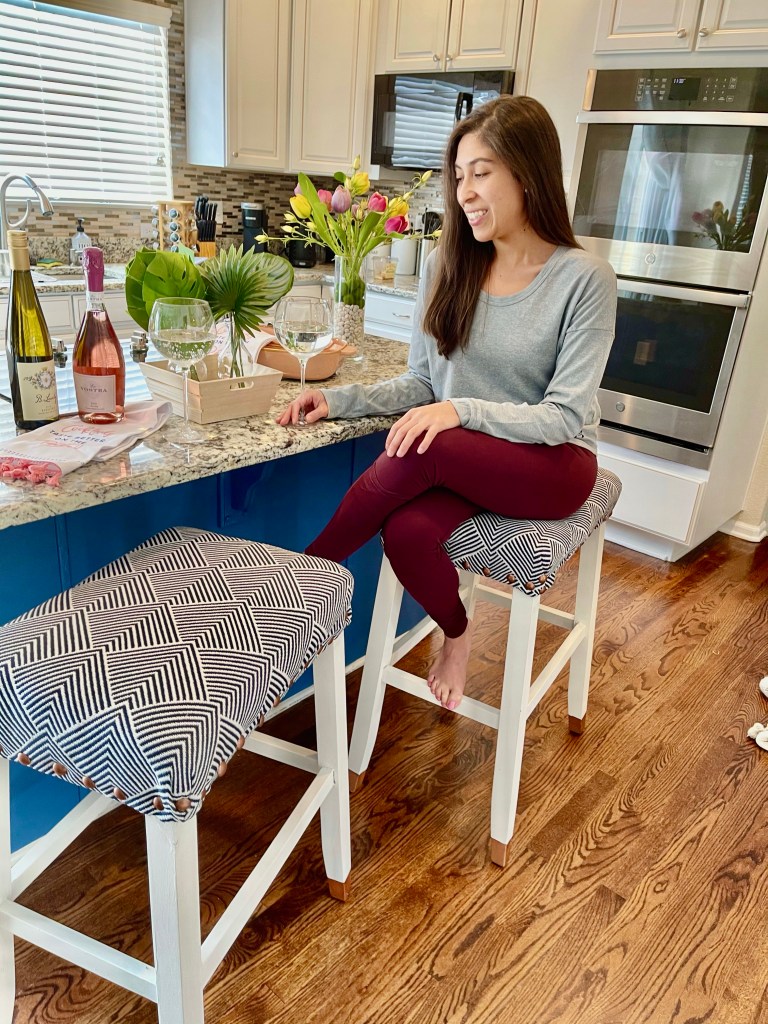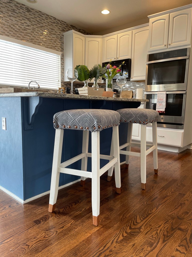 Here is how it turned out. I was able to make it look more custom with the small details like adding the metallic tips and the decorative tacks. The fabric I used was for outdoor furniture so it is super durable and easy to clean. I loved how they turned out but now I think they are a little too modern for our Kitchen so I will need to do some more modern updates to our Kitchen but that’s for another blog post.