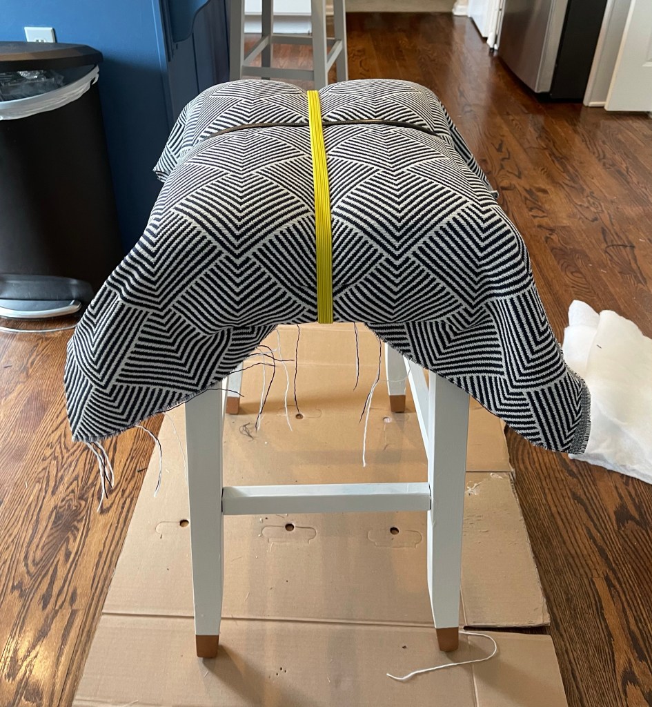 I got the new fabric cover and placed it over the cushion and stuffing and made sure that the pattern lined up with the edges. Once I placed the fabric exactly how I wanted it on the stool I used bungie cables to secure it. Then I flipped the stool over seat side down