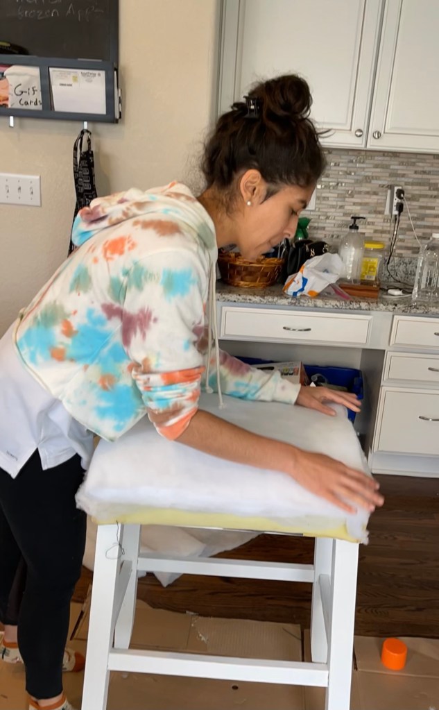 I used the existing cushioning. The existing cushion was tufted so I used the stuffing to fill in the tufted holes and added an extra rectangle of stuffing on top so that it would be flat. I used the Rotary cutter to make sure the stuffing had strainght lines on the recetangle that lined up with the cushion. If you don’t do this your cushion will look lumpy and uneven when you put the fabric on. I used the crafting spray glue to secure the added stuffing.