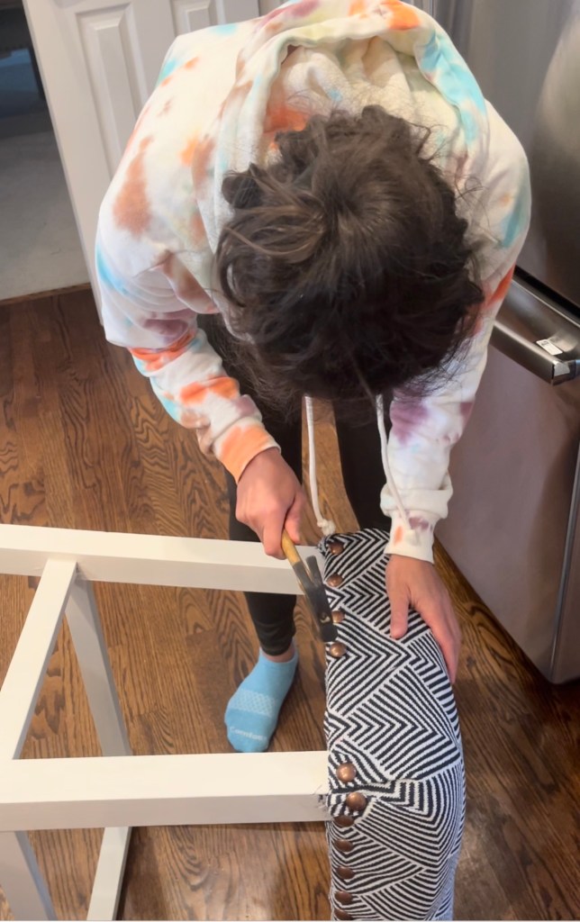 The first thing I did was remove the existing black faux leather fabric cover. I flipped the stool over so the legs faced up and took out all the staples with the pliers. I kept the coverings and put them to the side