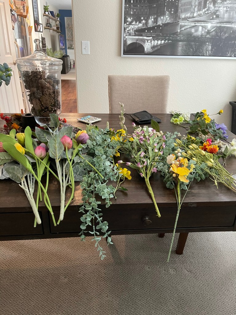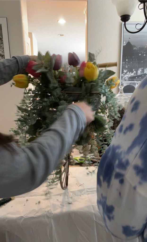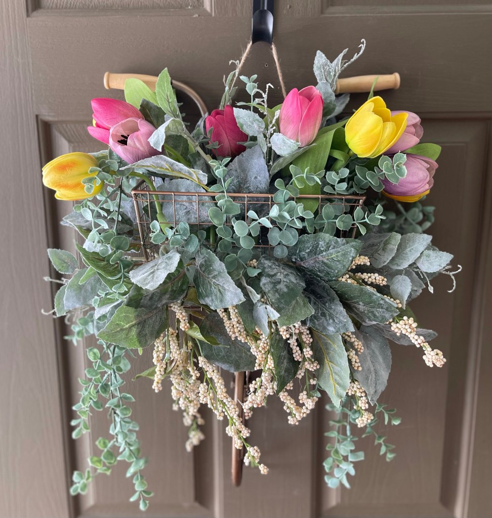 Spring has sprung! What better way to welcome spring than to hang a beautiful spring wreath on your front door. If you are looking for an alternative to a typical round wreath this is the blog post for you. As part of my spring projects Spring Projects, Adding Color I am making wreaths for our door. Here is the first one that we did.