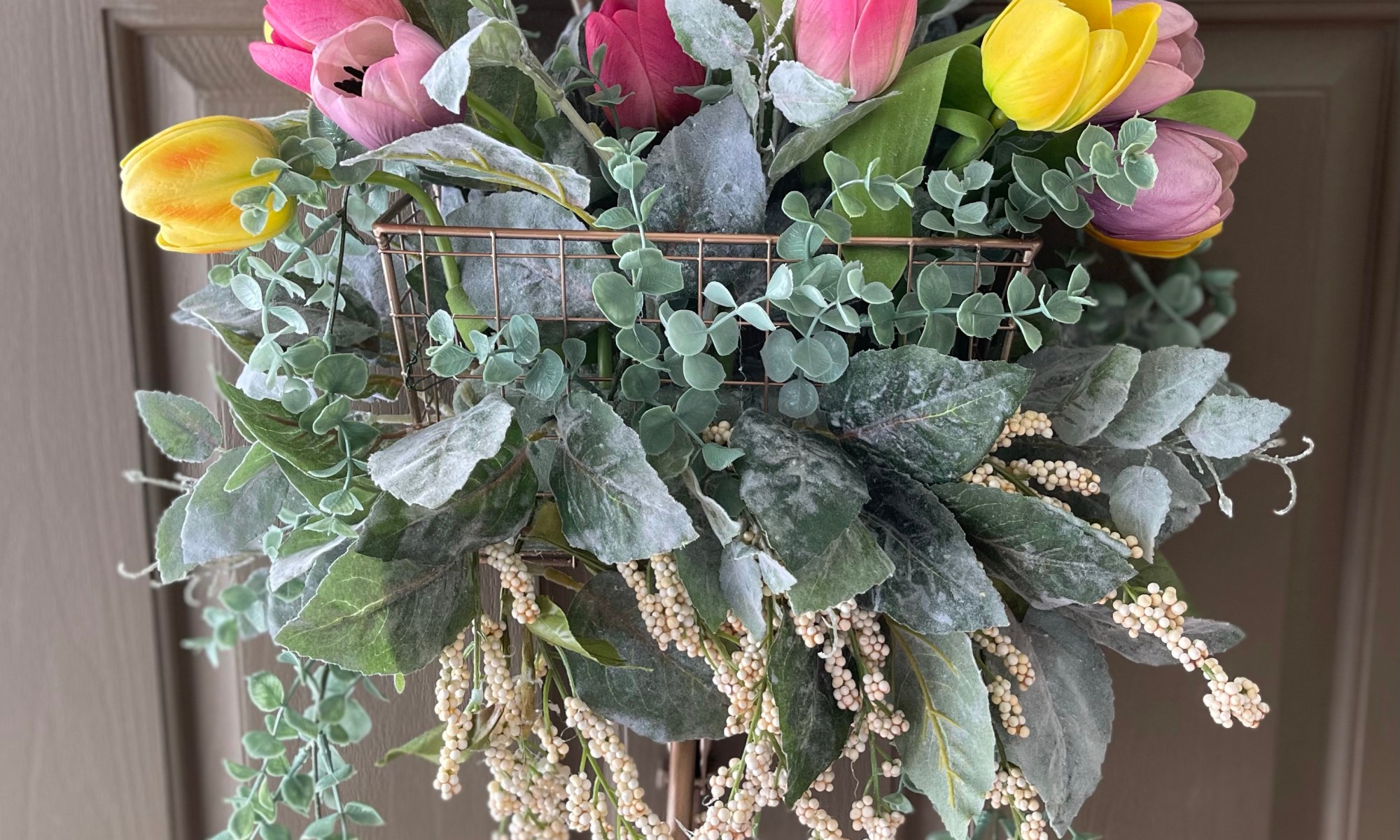 - Silk flower assortment including: Colorful Tulips, Eucalyptus Vines, Eucalyptus leaves and Floral Vine