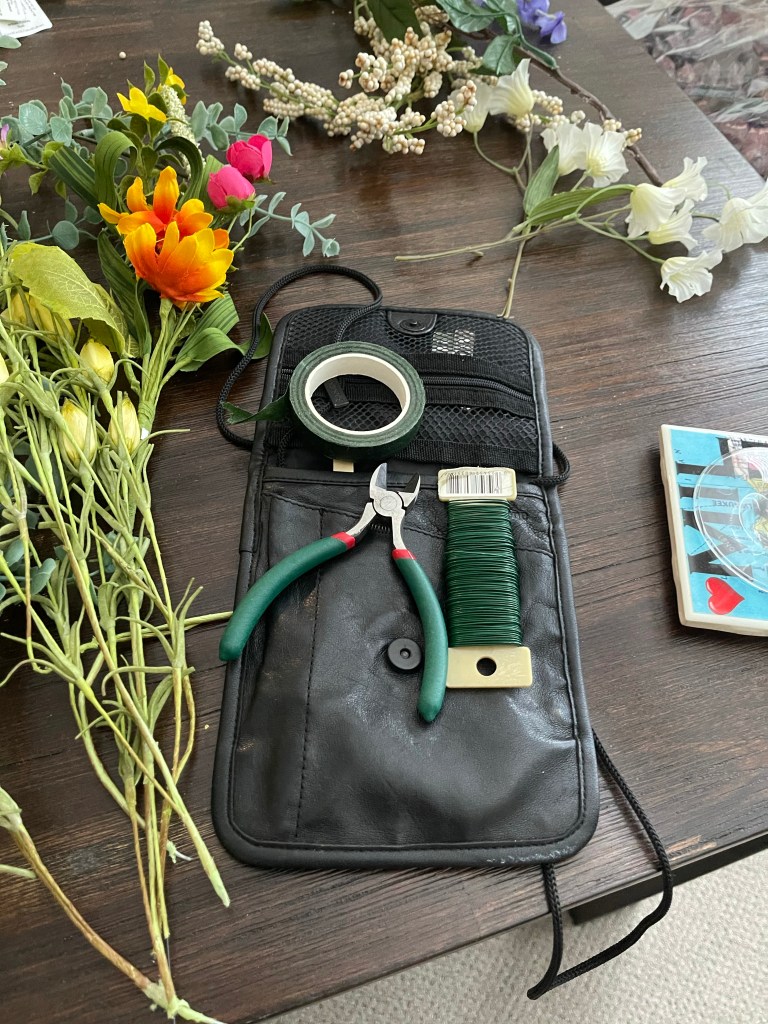 The white floral vine was added to the front of the basket to cover the bottom of the floral foam using floral wire and the glue gun. We glued the tips on the stems of the floral with a glue gun and then we pushed it into the green floral foam to secure it