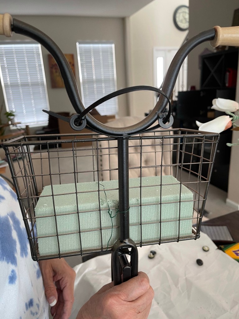Next we attached the foam block to the base inside of the basket using the glue gun and floral wire.