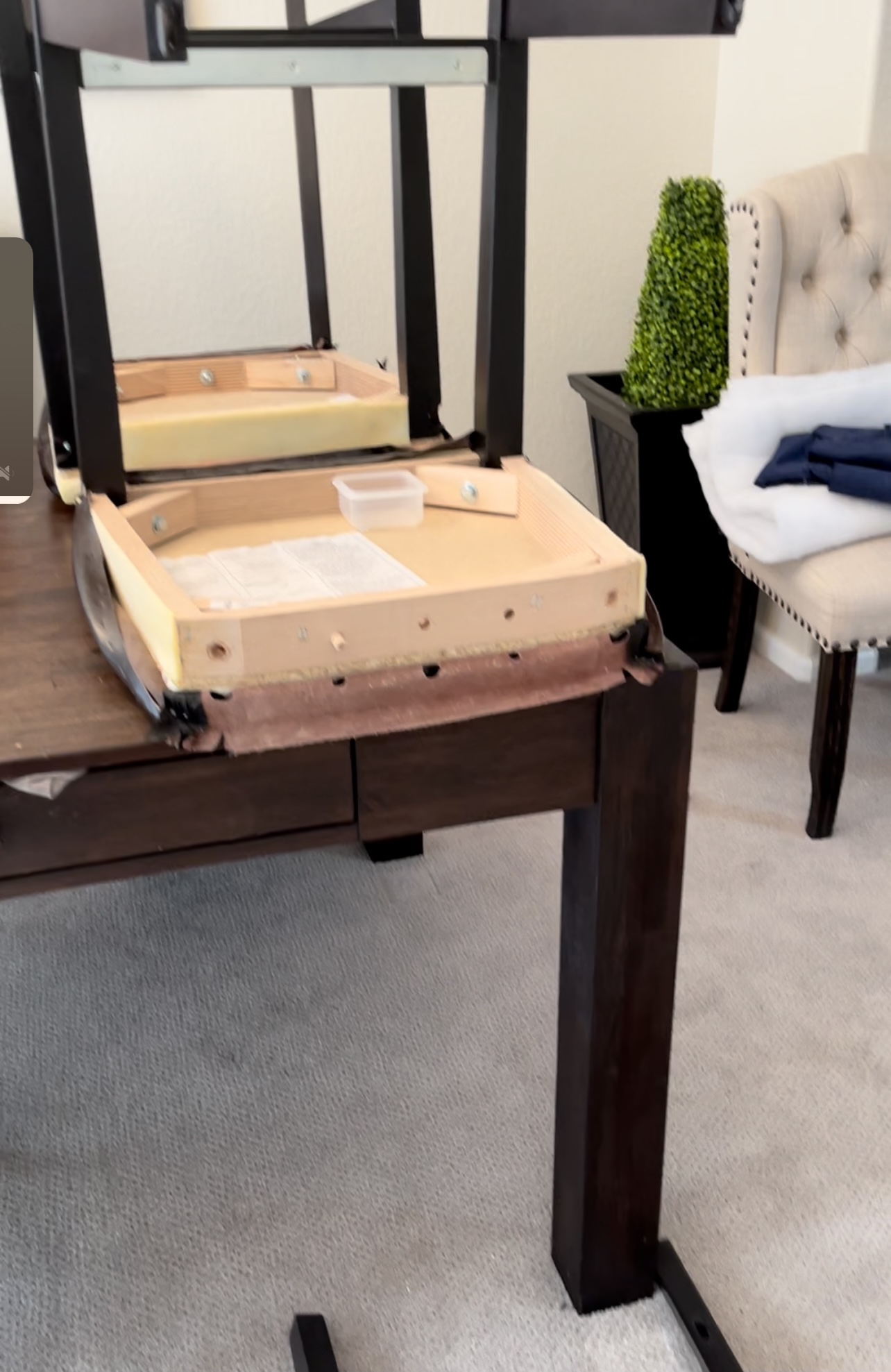 I used the Arrow staple puller to remove the staples that were holding the fabric to the chair. I had to separate the seat and the back in order to remove the fabric. I unscrewed the seat from the back of the chair and made sure to put the screws in a Ziploc bag where I can find them later. In hindsight I should have taken a picture of how all the screws went in so I wouldn’t have to remember later.