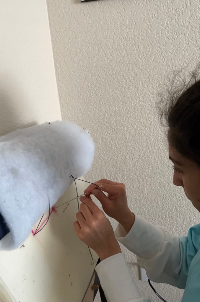We sewed on the buttons to the fabric with button thread. On the back side of the fabric we left two strings so that we can tie them in the back later. We went through two sets of buttons. We used a button cover kit to make buttons with the fabric but this proved to be very difficult and they did not turn out that great. I wanted something that would look more unique and custom that gave more of a wow factor. Instead we found these gold buttons we found at Joanne Fabrics, they had one of the best selections we found. This was a lot easier option.
