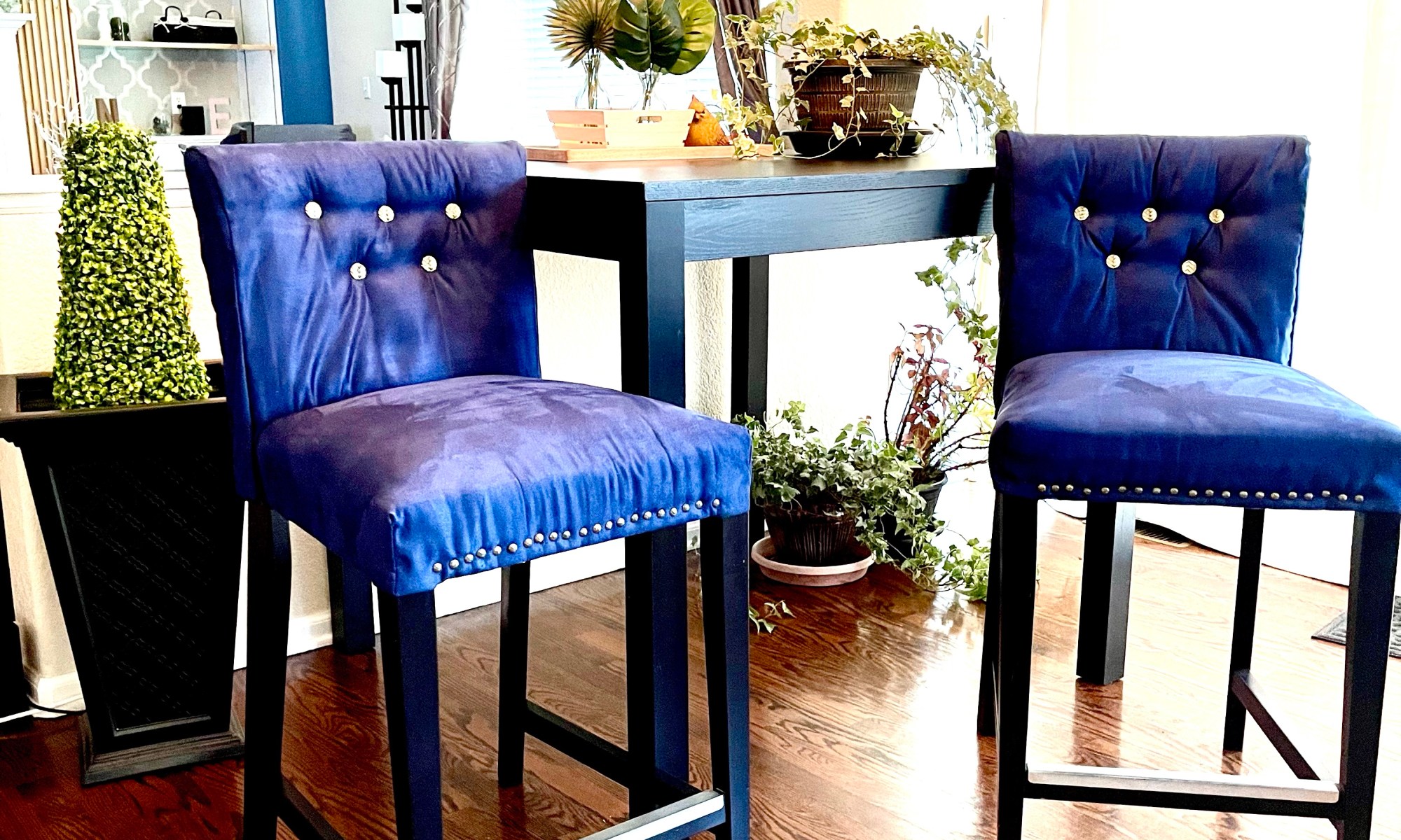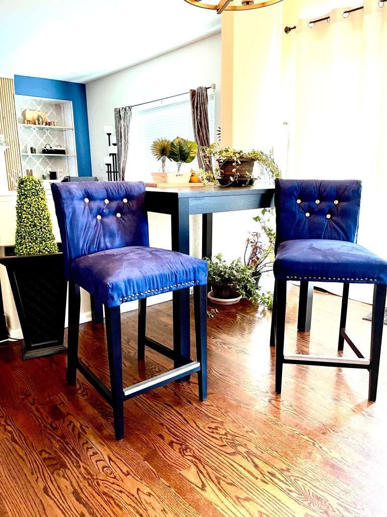 This is my second set of bar stools that I upgraded. The first set turned out well and gave me the confidence to take on these larger bar stools. See my previous bar stool project No Sew Barstool DIY. This set of Bar Stool Chairs were more involved because it required sewing and tufting. I got these Bar stools for my very first apartment over 10 years ago. They have held up well but I thought they were pretty plain and flat. I wanted to make them more comfortable and cozier by adding additional cushion, softer fabric, and tufting. I have done tufting before but I did it a little differently this time. Here is how I did it.