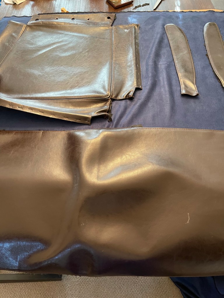 I measured the seat first it was 17″ long 19″ wide and the Back was 34″ by 40″. This allowed me to determine how much fabric I needed, which was 110” of fabric.