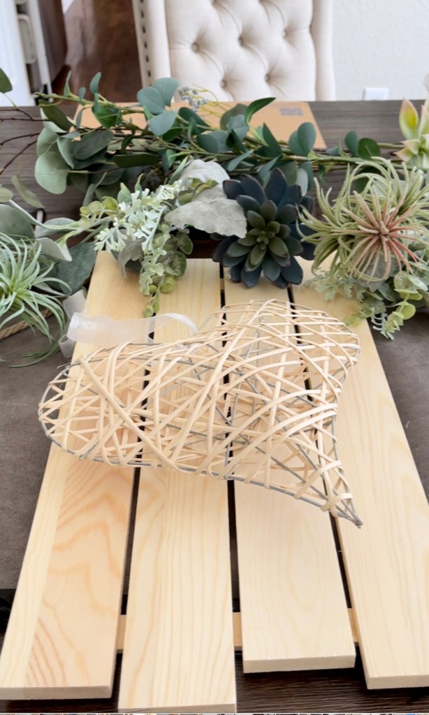 I attached the heart decoration center piece first. I chose the heart as my centerpiece and decorated around it. I used the zip ties and fastened the heart to the wood. I used about two zip ties to secure it.