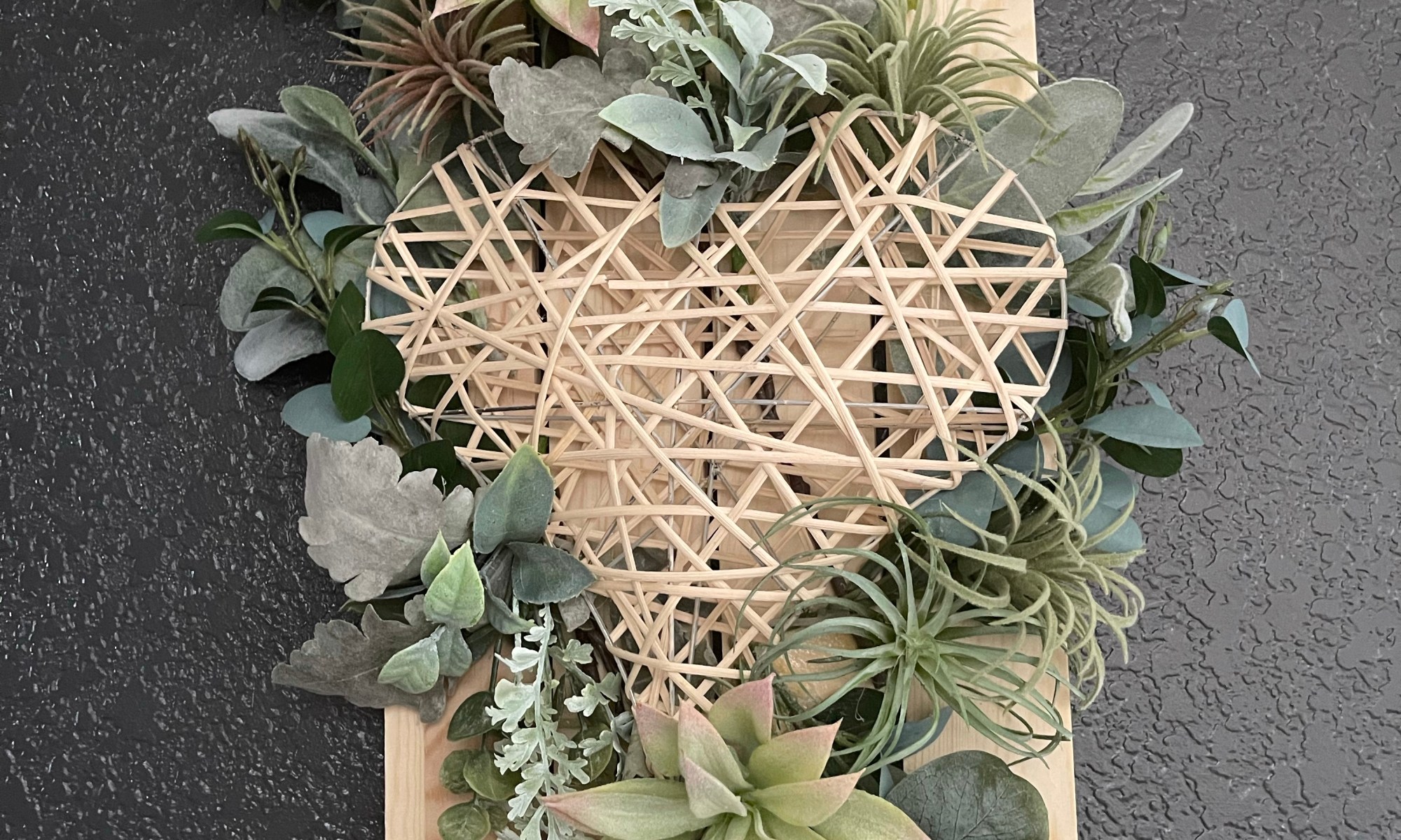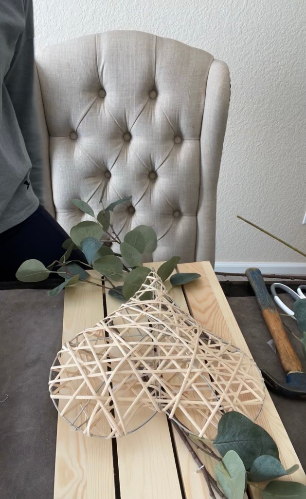 After I secured the center piece I started with the longer eucalyptus leaves and glued them with the gorilla glue to the diagonal sides of the wreath. I tried stapling them on but that didn’t work because the stems were too thick. The glue didn’t dry right away so I used one zip tie on each piece to secure them. In hindsight I should have sanded the wood wall décor piece so that the glue stuck better before I started. The wood sign had a finish on it that made the glue not stick as well.