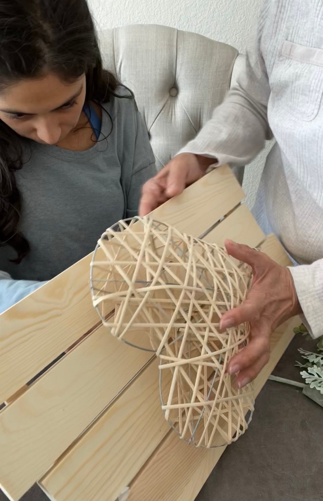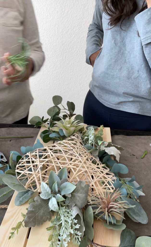 I trimmed some of the eucalyptus leaves to make shorter pieces to be the leaf filler with the floral tool pliers. We used the leaf filler to outline the heart center piece and give it more definition because it kind of blended in. We filled in the gaps as we saw them with the leaf filler.