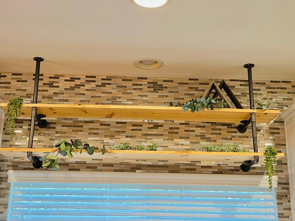 We just finished installing open shelving in our kitchen. We had an awkward blank space above our sink and wanted to put something there. We were debating about putting up a planter but then decided that shelves would be more practical and easier to clean.