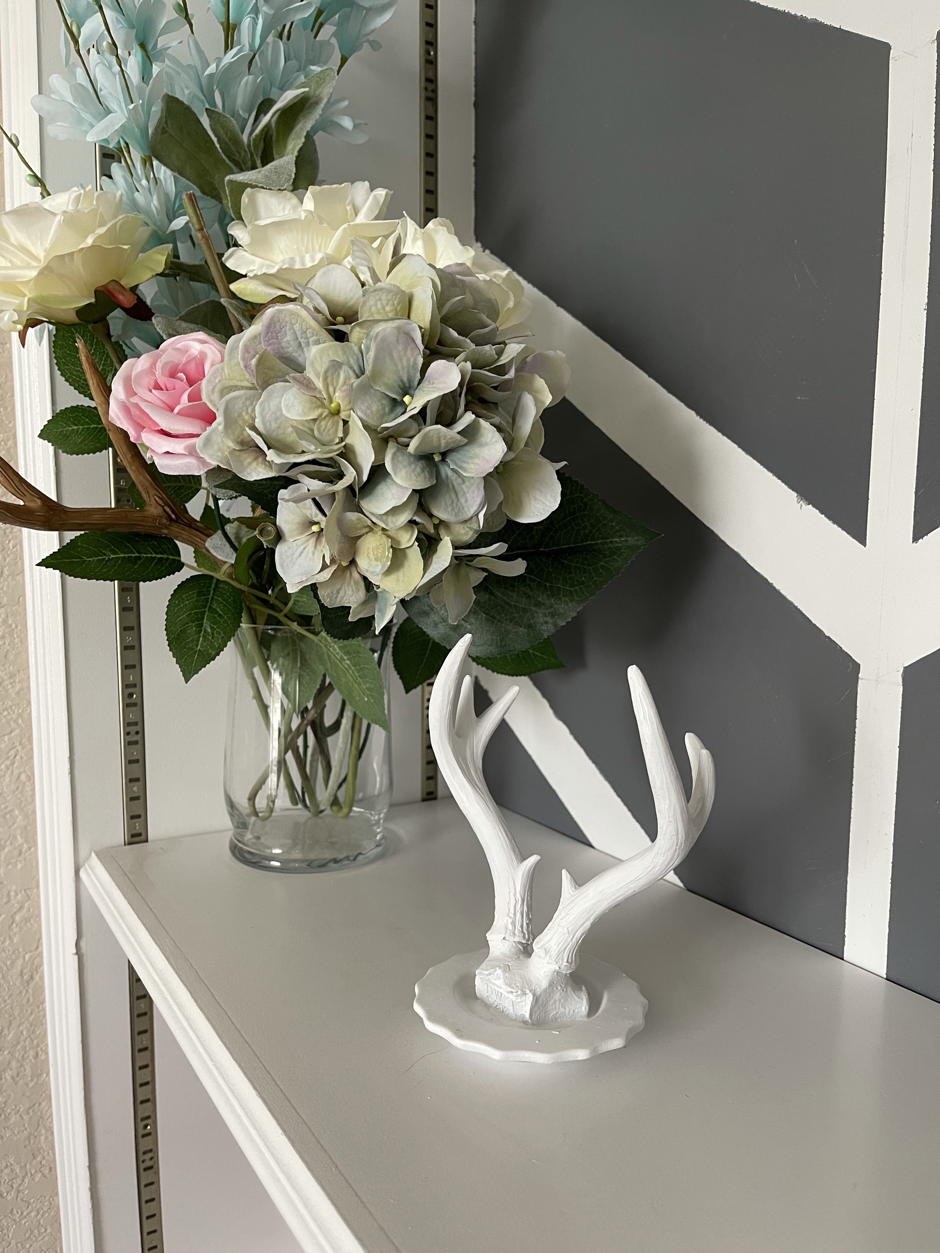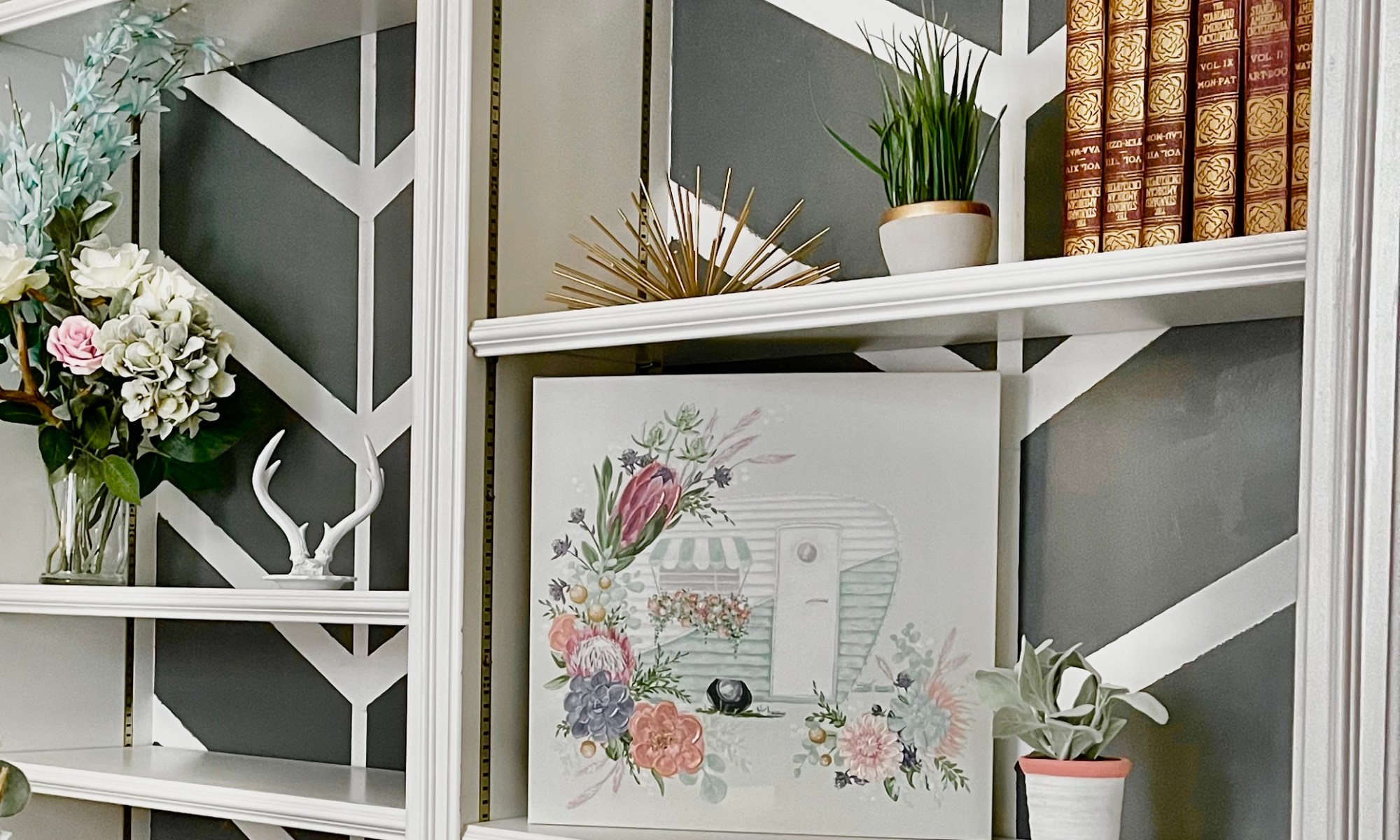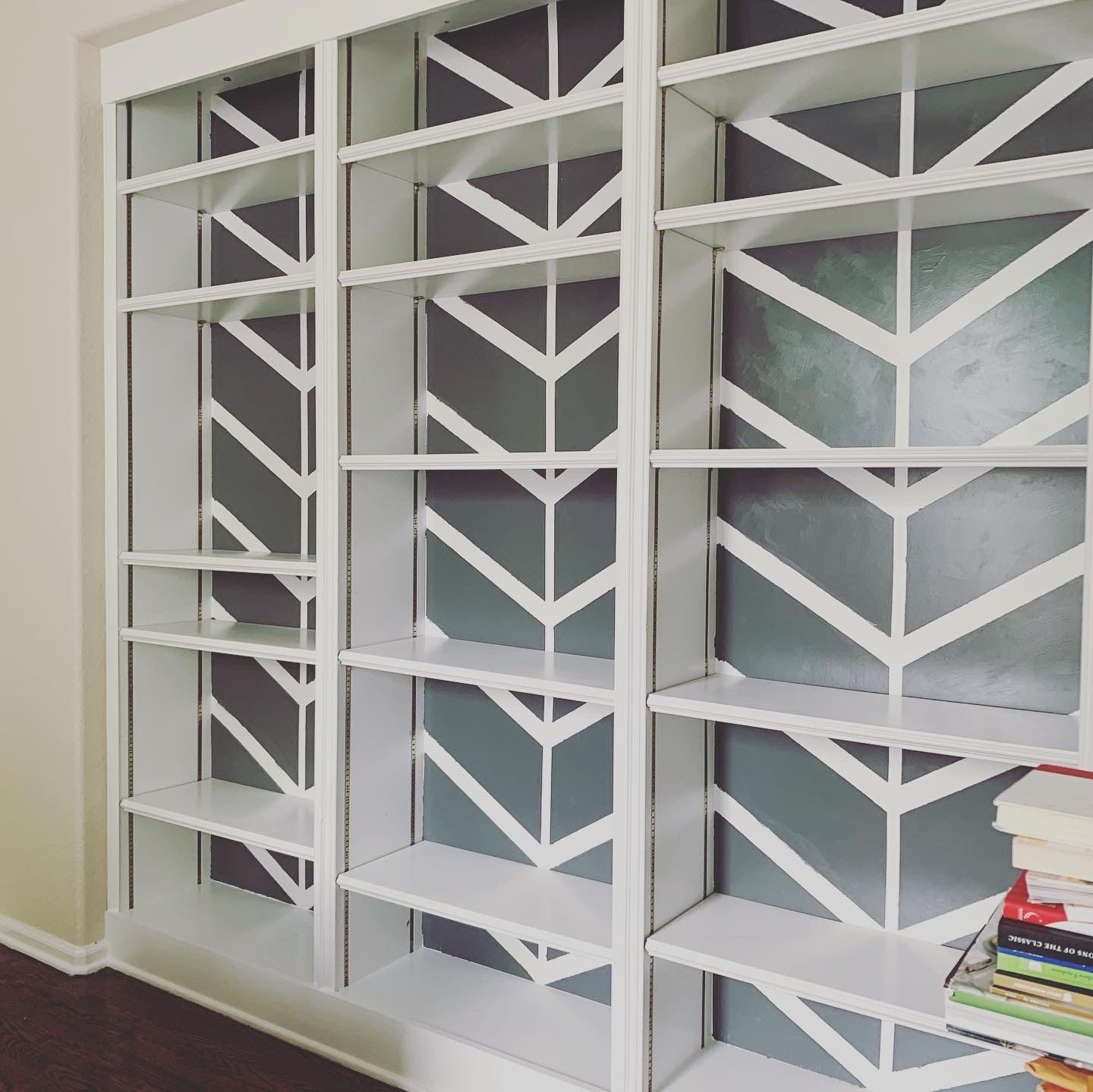 A background for your bookshelf will make the décor items you choose pop and look even better. Also, If you don’t have a ton of stuff to put on the bookshelf a background helps to fill in the blank spaces and make them look less obvious. There are tons of options for backgrounds. There are lots of wall paper backgrounds to choose from and they have some that are pretty easy to apply. You don’t even need any special tools or anything to apply peel and stick wall paper. If you don’t like the idea of doing wall paper or can’t find one you like then painting a background is also a great option. I painted the design on my bookshelf background. See how I made it on my post How To Create a DIY Bookcase Accent Wall in 8 Easy Steps. This was a pretty simple project that I did over a weekend. Either option you choose wallpaper or painting its super affordable and makes a huge impact.