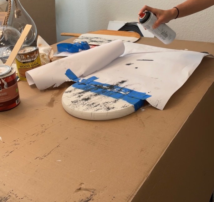 I repeated these steps for both boards on both sides. I did both sides in case one side turned out better than the other. On the smaller circular one I spray painted the center with a metallic spray paint one side and left the other side with a white center. I did this so that I had both options to display.
