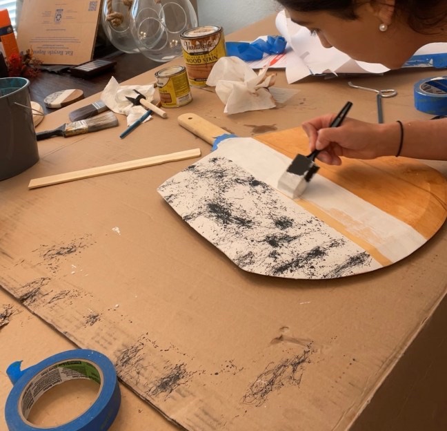 Using the sponge paint brush I painted the white paint up to where I applied the V with the painters tape near the handle.