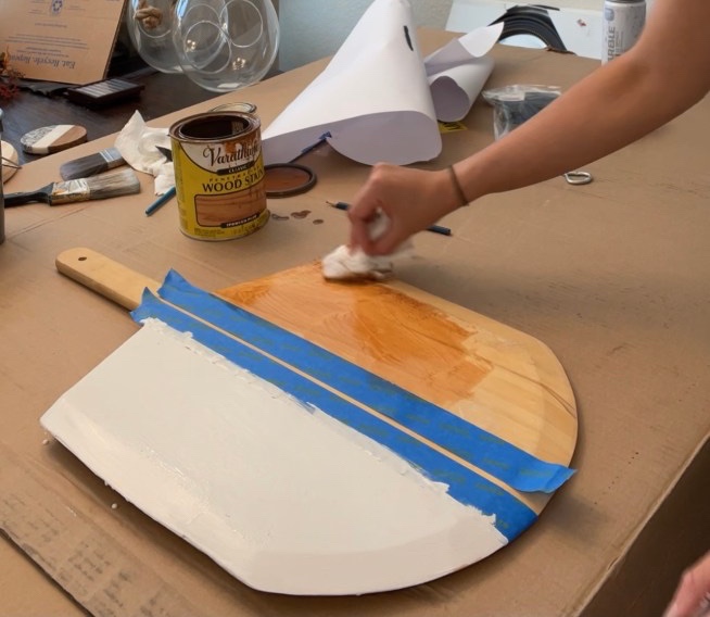 I used the wood stain and applied it with a paper towel on the handle up to the white paint