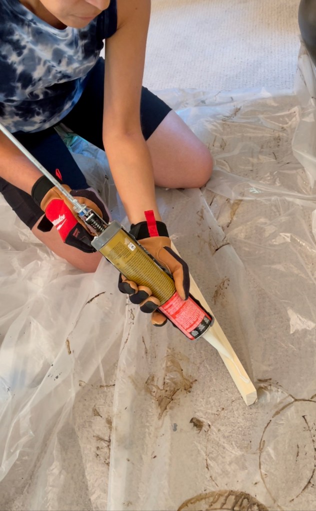 On the wood slat I picked the side of the wood that I wanted to be facing outwards and determined which side I wanted to be facing towards the wall. Typically you want the less damaged best looking side of the wood facing outwards. On the side I wanted to face towards the wall I started applying the liquid nails. I used a caulking gun and spread it sparingly. You don’t need too much.