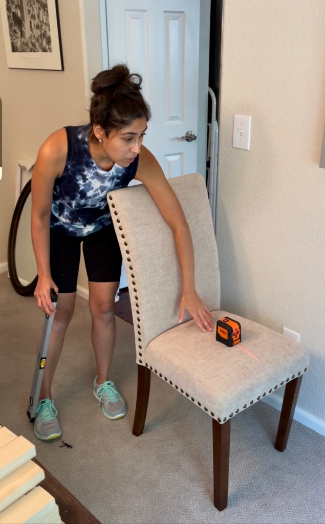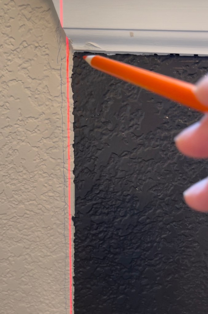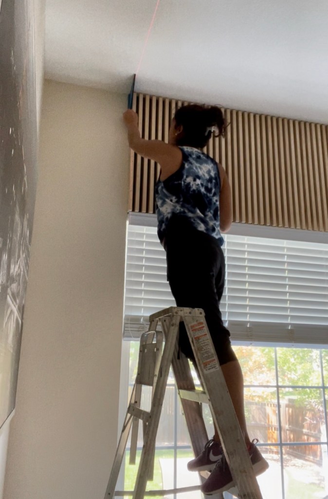 The first thing I did was used a laser level to determine the line of where the first slat will go. I used a regular level to confirm that the line was straight. Then I drew the line with a pencil on the wall.