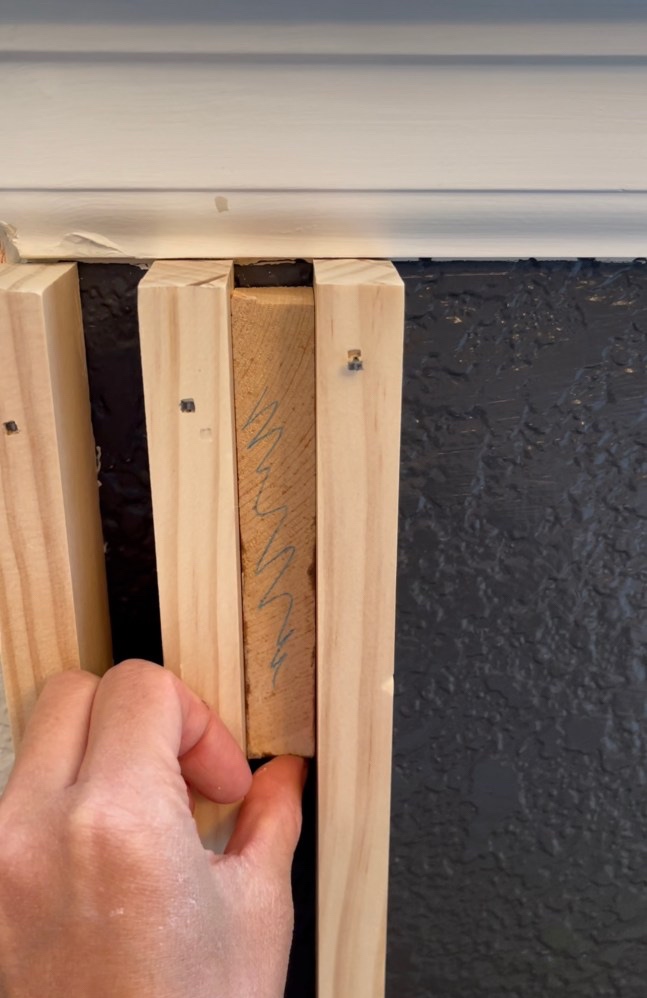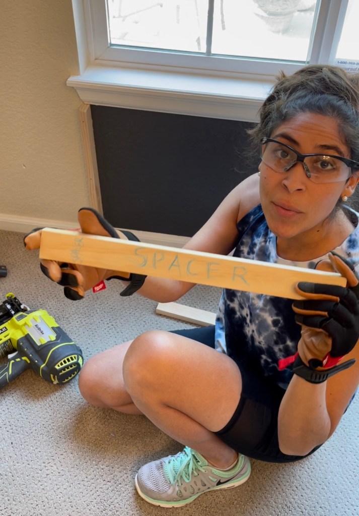 According to my initial calculations I wanted the wood slats to have a.75” space in between them. I used a spare piece of wood because I knew that they were .75” wide. I remeasured to confirm. I labeled my spacer so that I wouldn’t use it as a wood slat.