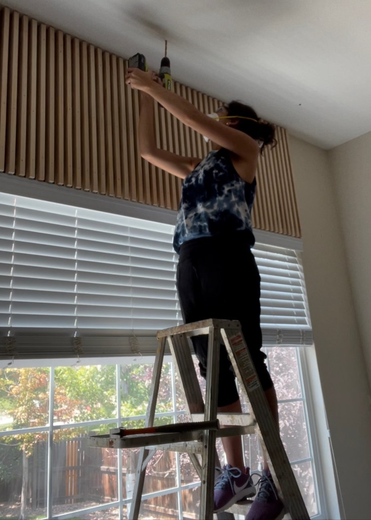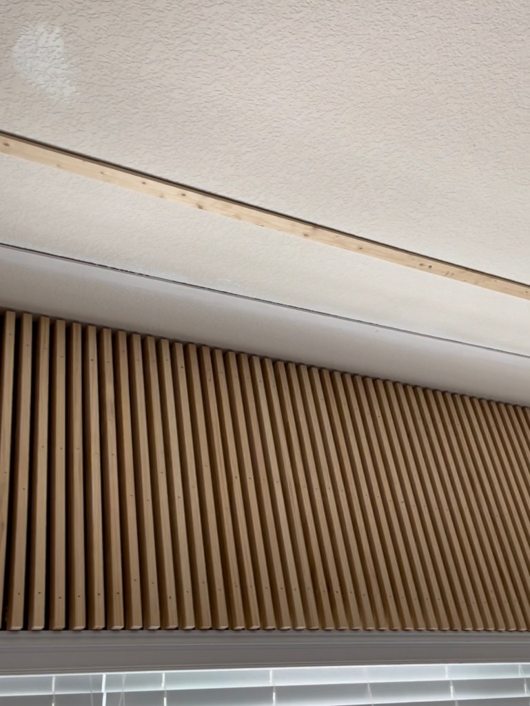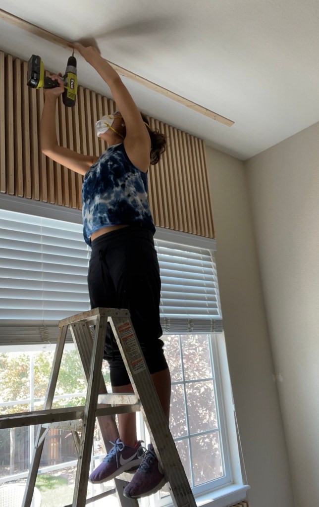 Nailing the wood slats on the ceiling and creating the waterfall effect