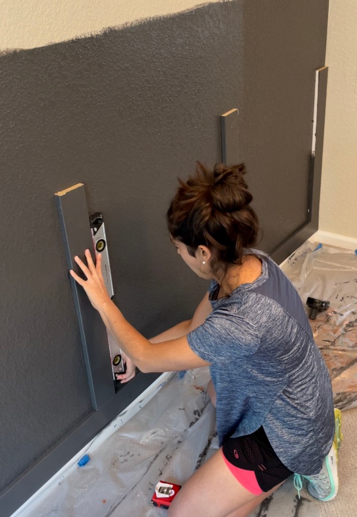I started at the bottom of the wall with the first horizontal section. I used liquid nails and applied it to the board and then placed the boards on the wall. I went through and secured the boards with a nail gun.
