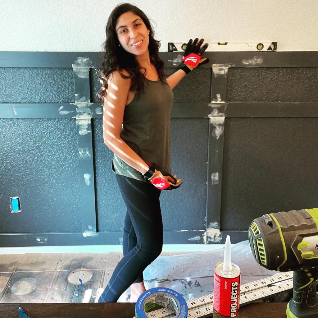 Next, I moved up to the first vertical section. I placed my first 29.5” vertical piece against where the walls meet. I calculated that each vertical piece should be 27.25” apart. Therefore, I measured 27.25” to the left of my first vertical piece and marked it on the wall. Then I put liquid nails on my boards and placed it on the wall were I marked. I used a level to make sure the board was straight and then secured it with a nail gun. I did this all the way across the wall