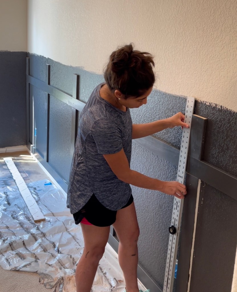 We started with the next 8” vertical section. Instead of measuring the space between each piece like we did before on the first vertical section we just used a T-square and made sure that the 8” vertical piece was in line with the first vertical piece than we applied the liquid nails and secured with nail gun all the 8” vertical pieces along the wall