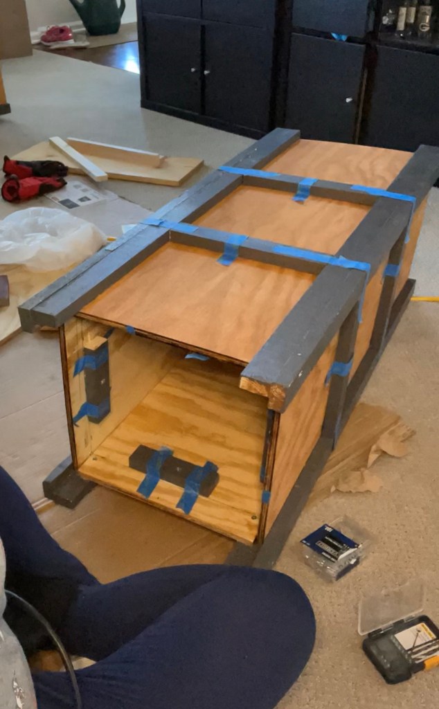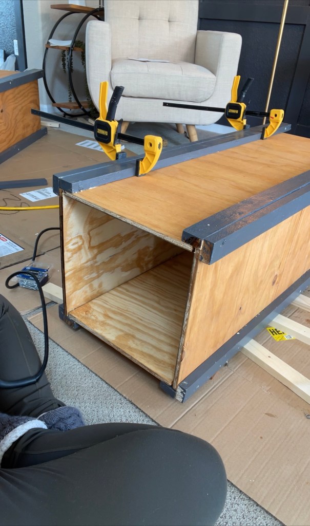 I attached 2 side panels to two of the corners with wood glue and secured with screws. I placed another panel in between them and glued and secured them to the frame. I flipped over the planter box and placed the last panel into the frame and secured with glue and screws