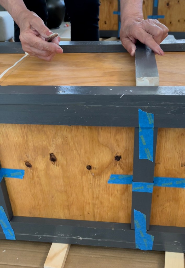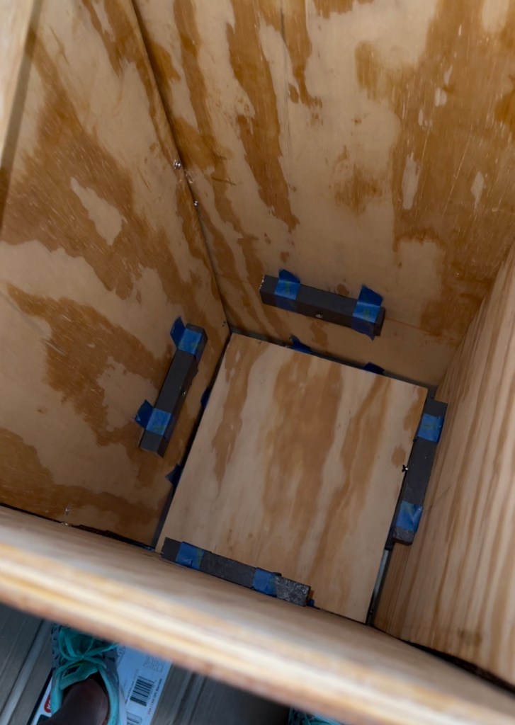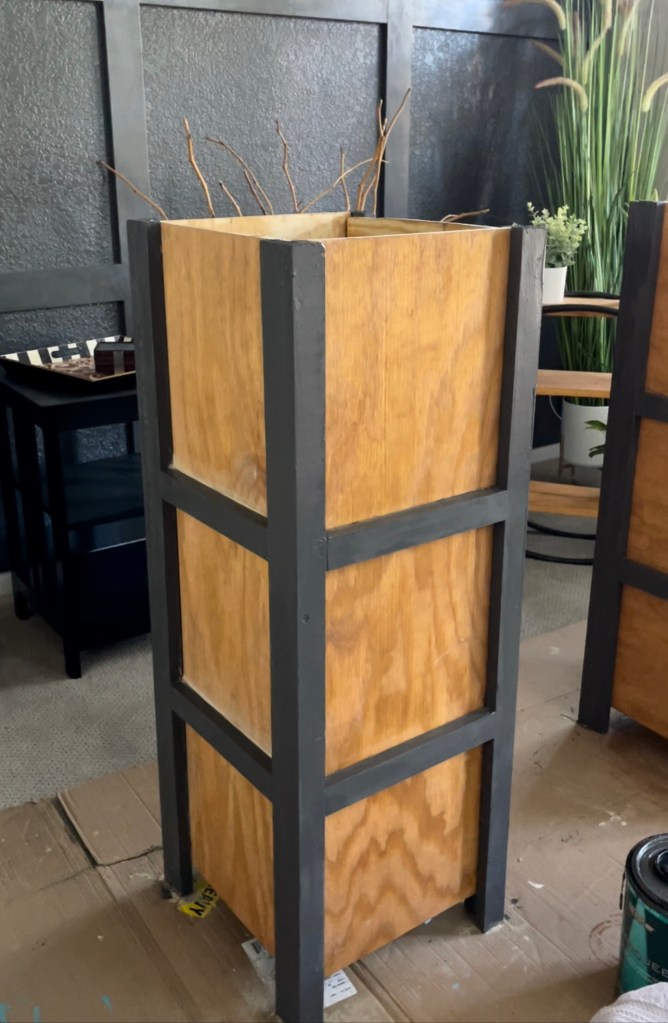 On the inside of the planters I made two sets of shelves for the bottoms. I used small wood pieces from cuts and attached them on the inside with screws to build two sets of shelves. Then I measured the inside of the planter and cut a square panel for the two bottom pieces. I cut the bottom pieces and placed them on the shelves to make the two layers. One layer was shallower to put the floral décor. The bottom section was to put sand and weight so the planters didn’t blow over.