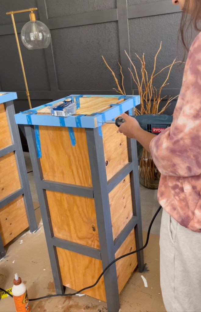I measured the 4 sides around the top of the planter to determine the lengths of the pieces I needed to cut to make the lip. I measured and cut my 4 pieces. I labeled all odthem again according to their corresponding panel, so I knew which panel they went with. I painted them Blue (Behr Mirror Lake) first and let them dry overnight. Then I attached them to the top of the planter with screws and wood glue. I glued first and used the Vice Grip to secure the pieces while I screwed in each side.