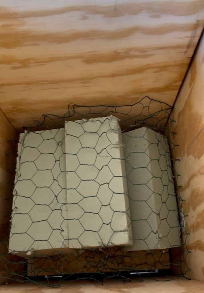 In order to create the floral arrangement, I first created the base first. I wrapped green floral foam in chicken wire and put it in the first shelf of the planters.
