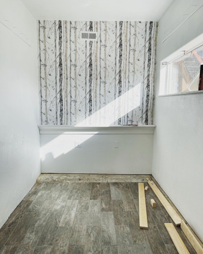 I finished putting up the Wallpaper in the mud room. It kept falling down before and I ran out of wallpaper really quick. This time I bought plenty and I used a spray adhesive to keep it up. It stayed up overnight so I am hoping that it stays up permanently. Next I bought some cubbies to cover up the weird bump in the floor. Eventually we want to build a bench over that bump.
