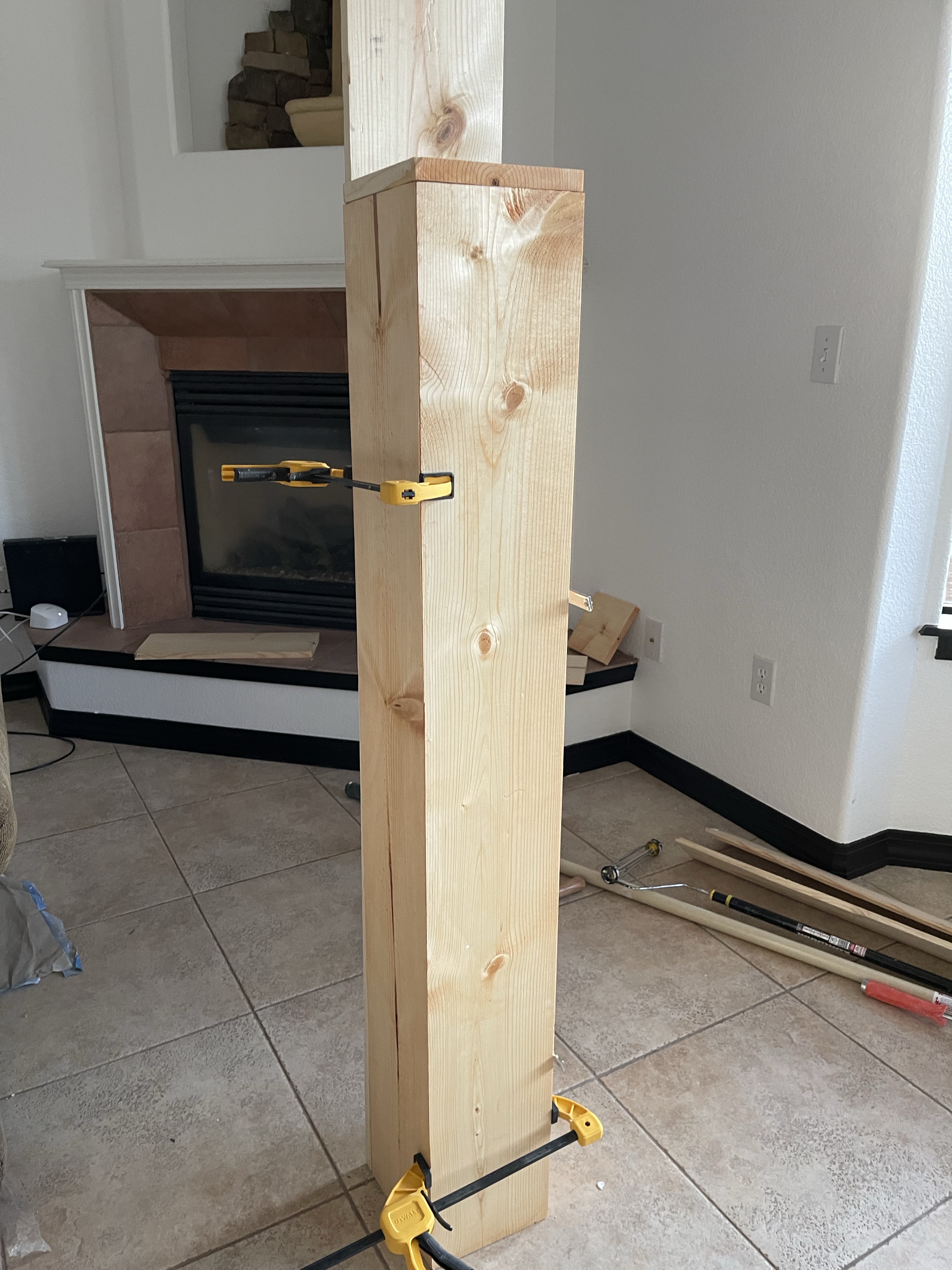 This week we finished the fireplace mantel. I used two pieces of common board and stained them same color as the shiplap wall. I did two angled cuts on the table saw so that the two boards fit together. One piece I used as the top of the mantel and one piece was for the face it. I used wood glue and glued them together. Then I drilled them to the mantel. I used wood filler to fill in the gaps and then stained the mantel again.