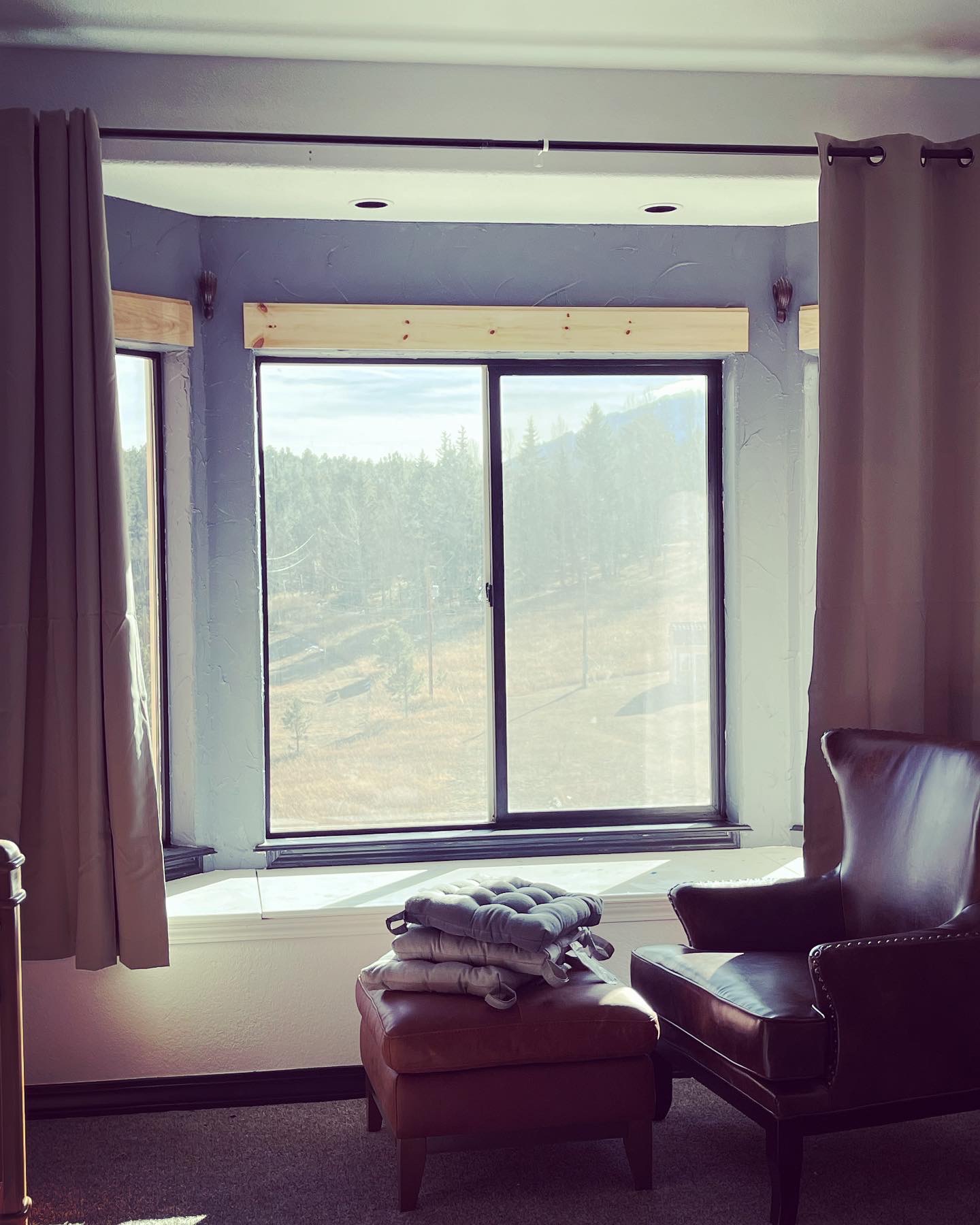 I cut leftover wood pieces. I stained them and nailed them over the top of the windows to tie all the wood accents together.