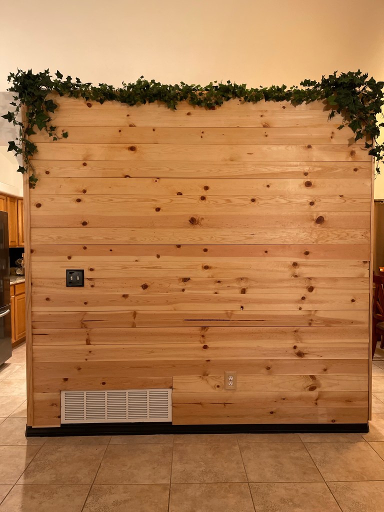 I added some faux wreaths to the shiplap wall to make it have more of a nature element and the green leaves look really good against the wall.
