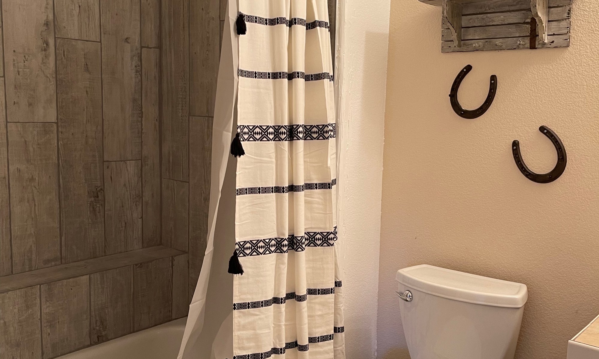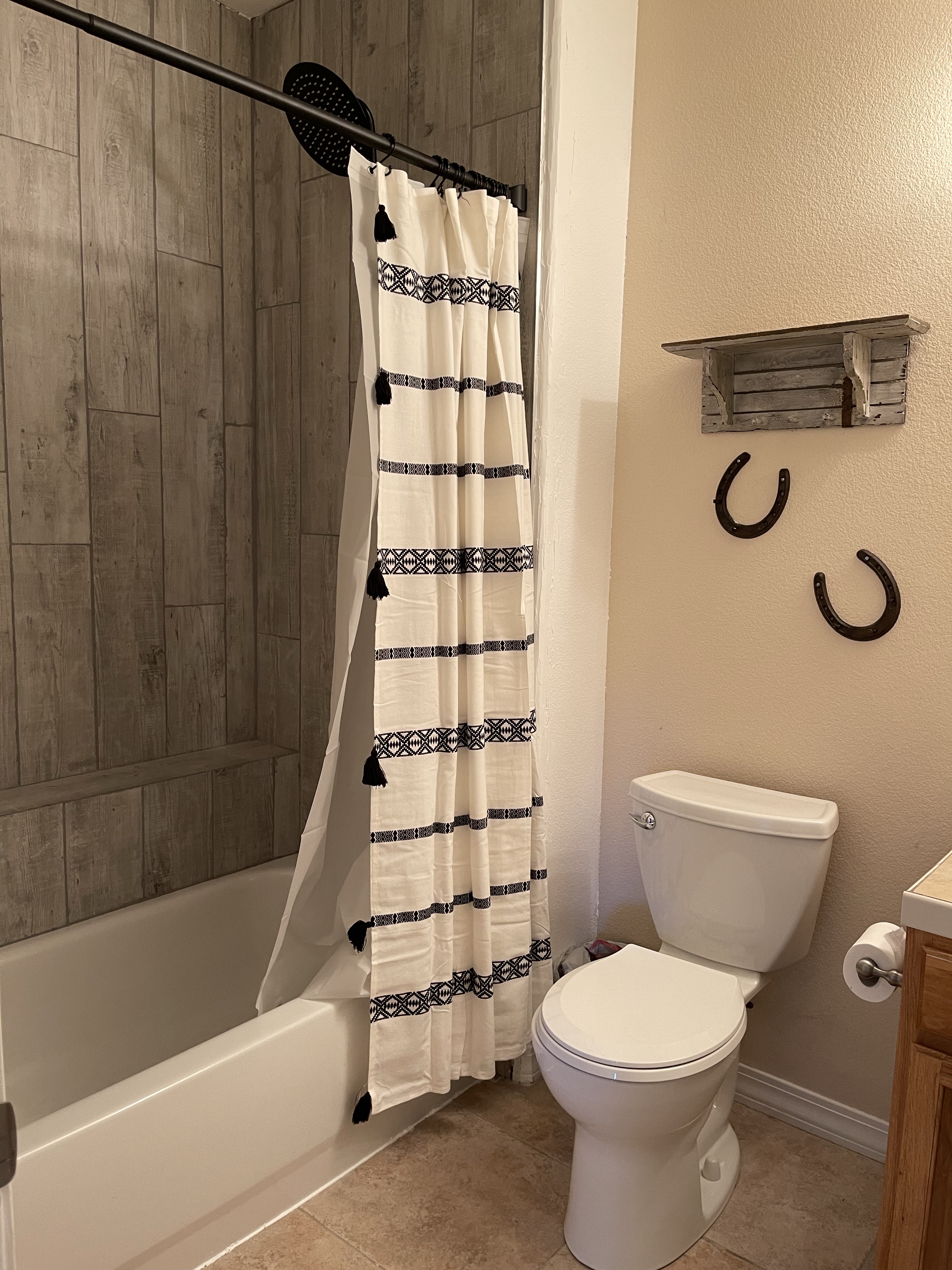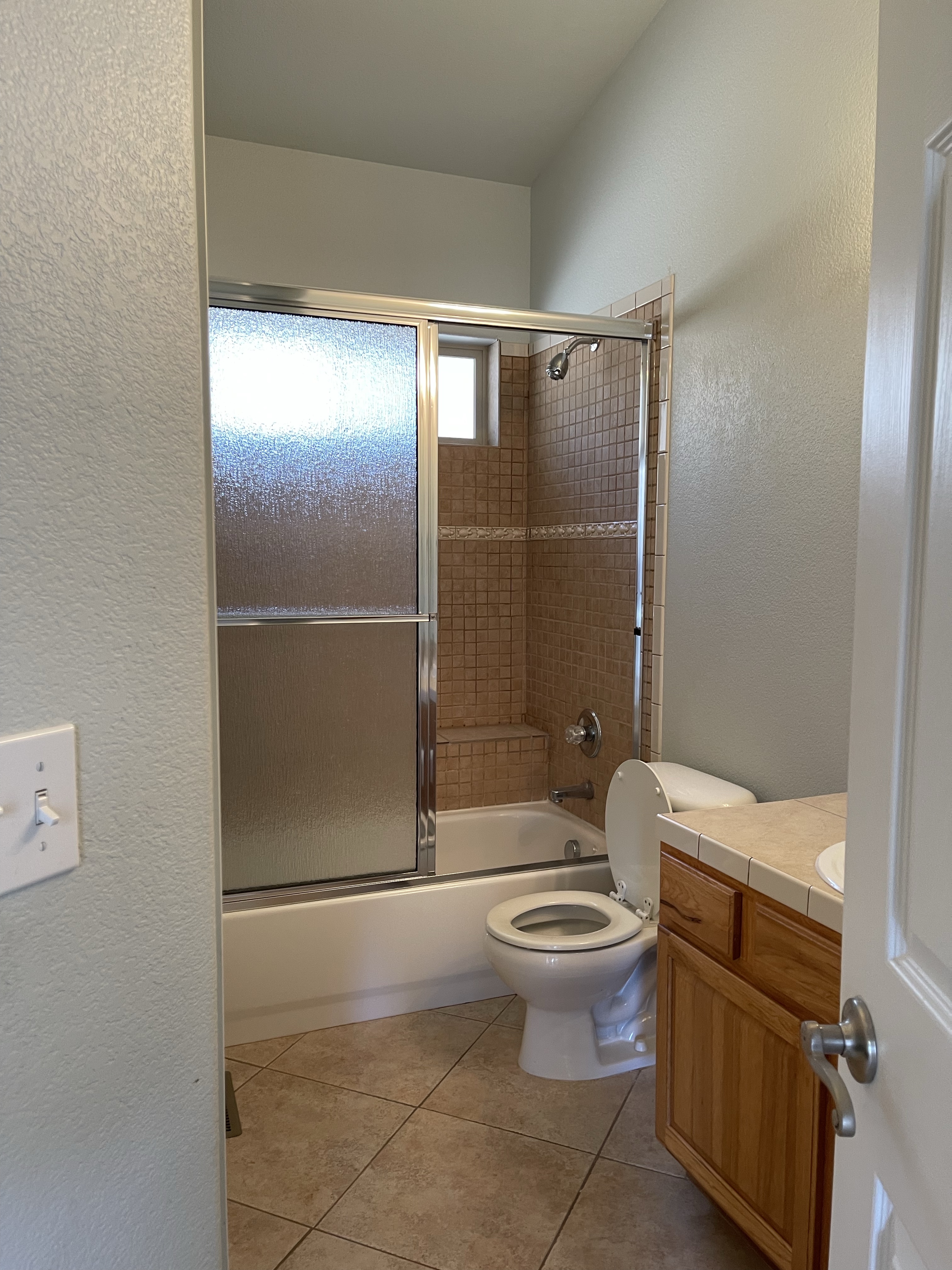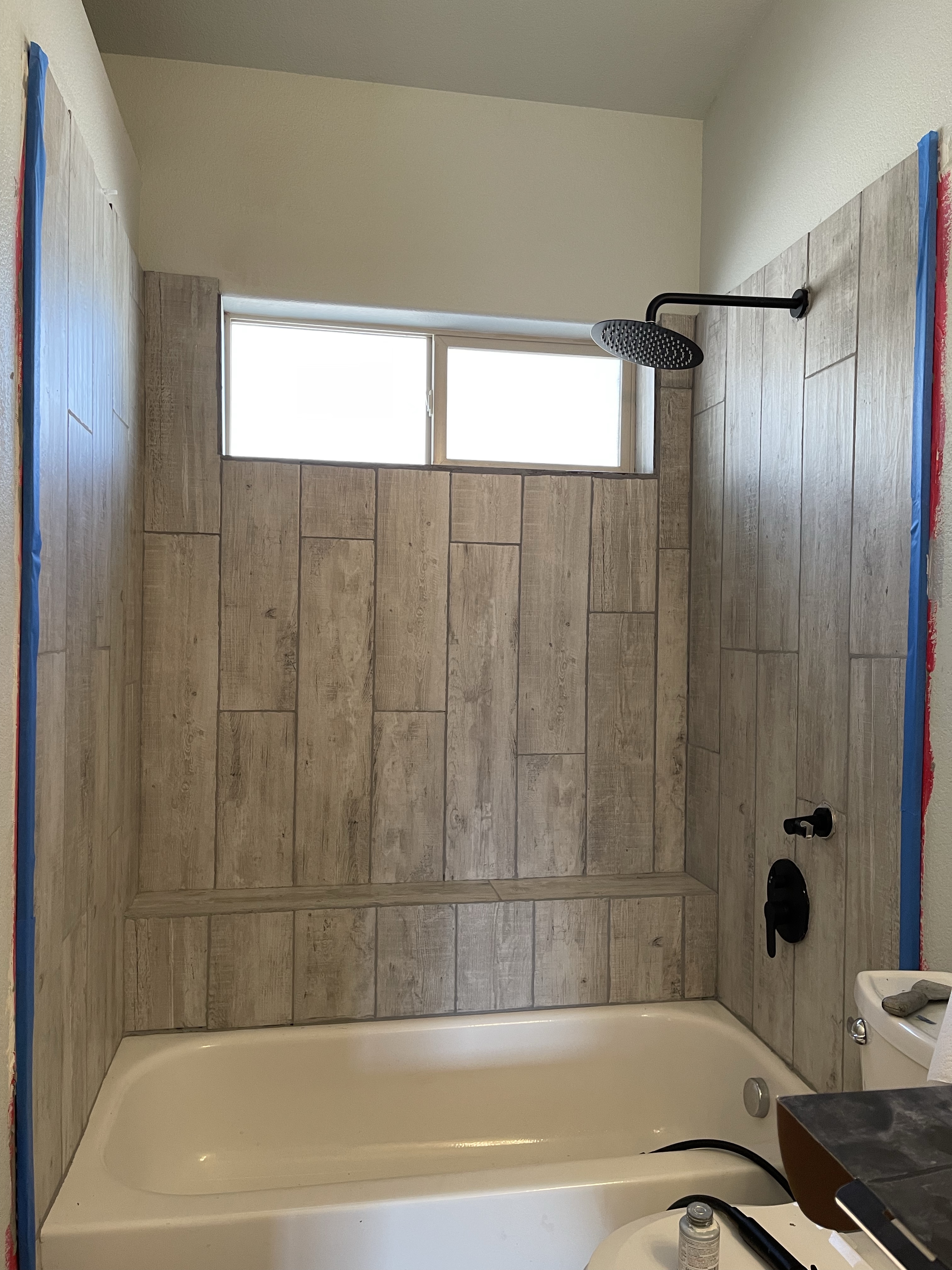 The shower tile was actually not that old it just looked really bad because it was small tiles with brown grout so it made it look dirty and did not photograph well. This is why I usually use larger tile. Larger tile is easier to install because its less cuts and grout and its just an overall better look. The showers had a really old glass door that we removed. We bought a wood tile that was super affordable from home dept. The tile both showers cost less than $200.